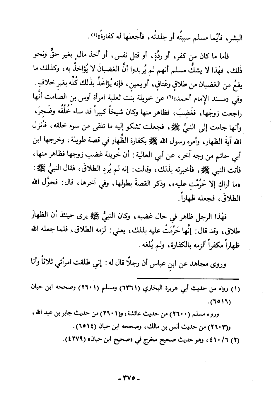 الْبَشَرُ، فَأَيُّمَا مُسْلِمٍ سَبَبْتُهُ أَوْ جَلَدْتُهُ، فَاجْعَلْهَا لَهُ كَفَّارَةً» . فَأَمَّا مَا كَانَ مِنْ كُفْرٍ، أَوْ رِدَّةٍ، أَوْ قَتْلِ نَفْسٍ، أَوْ أَخْذِ مَالٍ بِغَيْرِ حَقٍّ وَنَحْوِ ذَلِكَ، فَهَذَا لَا يَشُكُّ مُسْلِمٌ أَنَّهُمْ لَمْ يُرِيدُوا أَنَّ الْغَضْبَانَ لَا يُؤَاخَذُ بِهِ، وَكَذَلِكَ مَا يَقَعُ مِنَ الْغَضْبَانِ مِنْ طَلَاقٍ وَعِتَاقٍ، أَوْ يَمِينٍ، فَإِنَّهُ يُؤَاخَذُ بِذَلِكَ كُلِّهِ بِغَيْرِ خِلَافٍ وَفِي " مُسْنَدِ الْإِمَامِ أَحْمَدَ "، «عَنْ خُوَيْلَةَ بِنْتِ ثَعْلَبَةَ امْرَأَةِ أَوْسِ بْنِ الصَّامِتِ أَنَّهَا رَاجَعَتْ زَوْجَهَا، فَغَضِبَ، فَظَاهَرَ مِنْهَا وَكَانَ شَيْخًا كَبِيرًا قَدْ سَاءَ خُلُقُهُ وَضَجِرَ، وَأَنَّهَا جَاءَتْ إِلَى النَّبِيِّ صَلَّى اللَّهُ عَلَيْهِ وَسَلَّمَ، فَجَعَلَتْ تَشْكُو إِلَيْهِ مَا تَلْقَى مِنْ سُوءِ خُلُقِهِ، فَأَنْزَلَ اللَّهُ آيَةَ الظِّهَارِ، وَأَمَرَهُ رَسُولُ اللَّهِ صَلَّى اللَّهُ عَلَيْهِ وَسَلَّمَ بِكَفَّارَةِ الظِّهَارِ» فِي قِصَّةٍ طَوِيلَةٍ، وَخَرَّجَهَا ابْنُ أَبِي حَاتِمٍ مِنْ وَجْهٍ آخَرَ عَنْ أَبِي الْعَالِيَةِ: «أَنْ خُوَيْلَةَ غَضِبَ زَوْجُهَا فَظَاهَرَ مِنْهَا، فَأَتَتِ النَّبِيَّ صَلَّى اللَّهُ عَلَيْهِ وَسَلَّمَ، فَأَخْبَرَتْهُ بِذَلِكَ، وَقَالَتْ: إِنَّهُ لَمْ يُرِدِ الطَّلَاقَ، فَقَالَ النَّبِيُّ صَلَّى اللَّهُ عَلَيْهِ وَسَلَّمَ: " مَا أَرَاكِ إِلَّا حَرُمْتِ عَلَيْهِ» ، وَذَكَرَ الْقِصَّةَ بِطُولِهَا، وَفِي آخِرِهَا، قَالَ: فَحَوَّلَ اللَّهُ الطَّلَاقَ، فَجَعَلَهُ ظِهَارًا. فَهَذَا الرَّجُلُ ظَاهَرَ فِي حَالِ غَضَبِهِ، وَكَانَ النَّبِيُّ صَلَّى اللَّهُ عَلَيْهِ وَسَلَّمَ يَرَى حِينَئِذٍ أَنَّ الظِّهَارَ طَلَاقٌ، وَقَدْ قَالَ: إِنَّهَا حَرُمَتْ عَلَيْهِ بِذَلِكَ، يَعْنِي: لَزِمَهُ الطَّلَاقُ، فَلَمَّا جَعَلَهُ اللَّهُ ظِهَارًا مُكَفَّرًا أَلْزَمَهُ بِالْكَفَّارَةِ، وَلَمْ يَلْغِهِ. وَرَوَى مُجَاهِدٌ عَنِ ابْنِ عَبَّاسٍ أَنَّ رَجُلًا قَالَ لَهُ: إِنِّي طَلَّقْتُ امْرَأَتِي ثَلَاثًا وَأَنَا