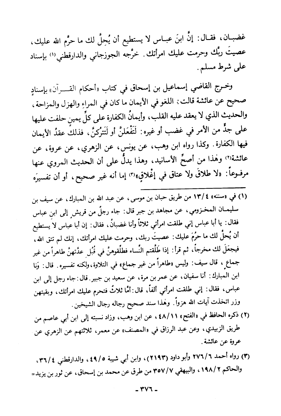 غَضْبَانُ، فَقَالَ: ابْنُ عَبَّاسٍ لَا يَسْتَطِيعُ أَنْ يُحِلَّ لَكَ مَا حَرَّمَ اللَّهُ عَلَيْكَ، عَصَيْتَ رَبَّكَ وَحَرُمَتْ عَلَيْكَ امْرَأَتُكَ خَرَّجَهُ الْجَوْزَجَانِيُّ وَالدَّارَقُطْنِيُّ بِإِسْنَادٍ عَلَى شَرْطِ مُسْلِمٍ.