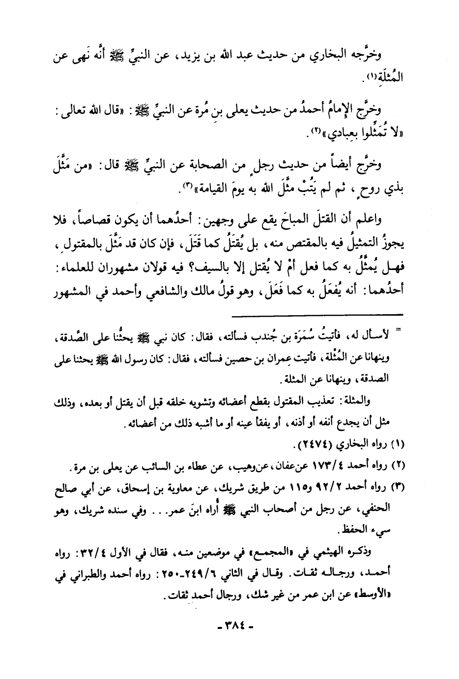 وَخَرَّجَ الْبُخَارِيُّ مِنْ حَدِيثِ عَبْدِ اللَّهِ بْنِ يَزِيدَ، «عَنِ النَّبِيِّ صَلَّى اللَّهُ عَلَيْهِ وَسَلَّمَ أَنَّهُ نَهَى عَنِ الْمُثْلَةِ» . وَخَرَّجَ الْإِمَامُ أَحْمَدُ مِنْ حَدِيثِ يَعْلَى بْنِ مُرَّةَ عَنِ النَّبِيِّ صَلَّى اللَّهُ عَلَيْهِ وَسَلَّمَ: «قَالَ اللَّهُ تَعَالَى: لَا تُمَثِّلُوا بِعِبَادِي» . وَخَرَّجَ أَيْضًا مِنْ حَدِيثِ رَجُلٍ مِنَ الصَّحَابَةِ عَنِ النَّبِيِّ صَلَّى اللَّهُ عَلَيْهِ وَسَلَّمَ قَالَ: «مَنْ مَثَّلٍ بِذِي رُوحٍ، ثُمَّ لَمْ يَتُبْ، مَثَّلَ اللَّهُ بِهِ يَوْمَ الْقِيَامَةِ» . وَاعْلَمْ أَنَّ الْقَتْلَ الْمُبَاحَ يَقَعُ عَلَى وَجْهَيْنِ: أَحَدُهُمَا قِصَاصٌ، فَلَا يَجُوزُ التَّمْثِيلُ فِيهِ بِالْمُقْتَصِّ مِنْهُ، بَلْ يُقْتَلُ كَمَا قَتَلَ، فَإِنْ كَانَ قَدْ مَثَّلَ بِالْمَقْتُولِ، فَهَلْ يُمَثَّلُ بِهِ كَمَا فَعَلَ أَمْ لَا يُقْتَلُ إِلَّا بِالسَّيْفِ؟ فِيهِ قَوْلَانِ مَشْهُورَانِ لِلْعُلَمَاءِ: أَحَدُهُمَا: أَنَّهُ يَفْعَلُ بِهِ كَمَا فَعَلَ، وَهُوَ قَوْلُ مَالِكٍ وَالشَّافِعِيِّ وَأَحْمَدَ فِي الْمَشْهُورِ