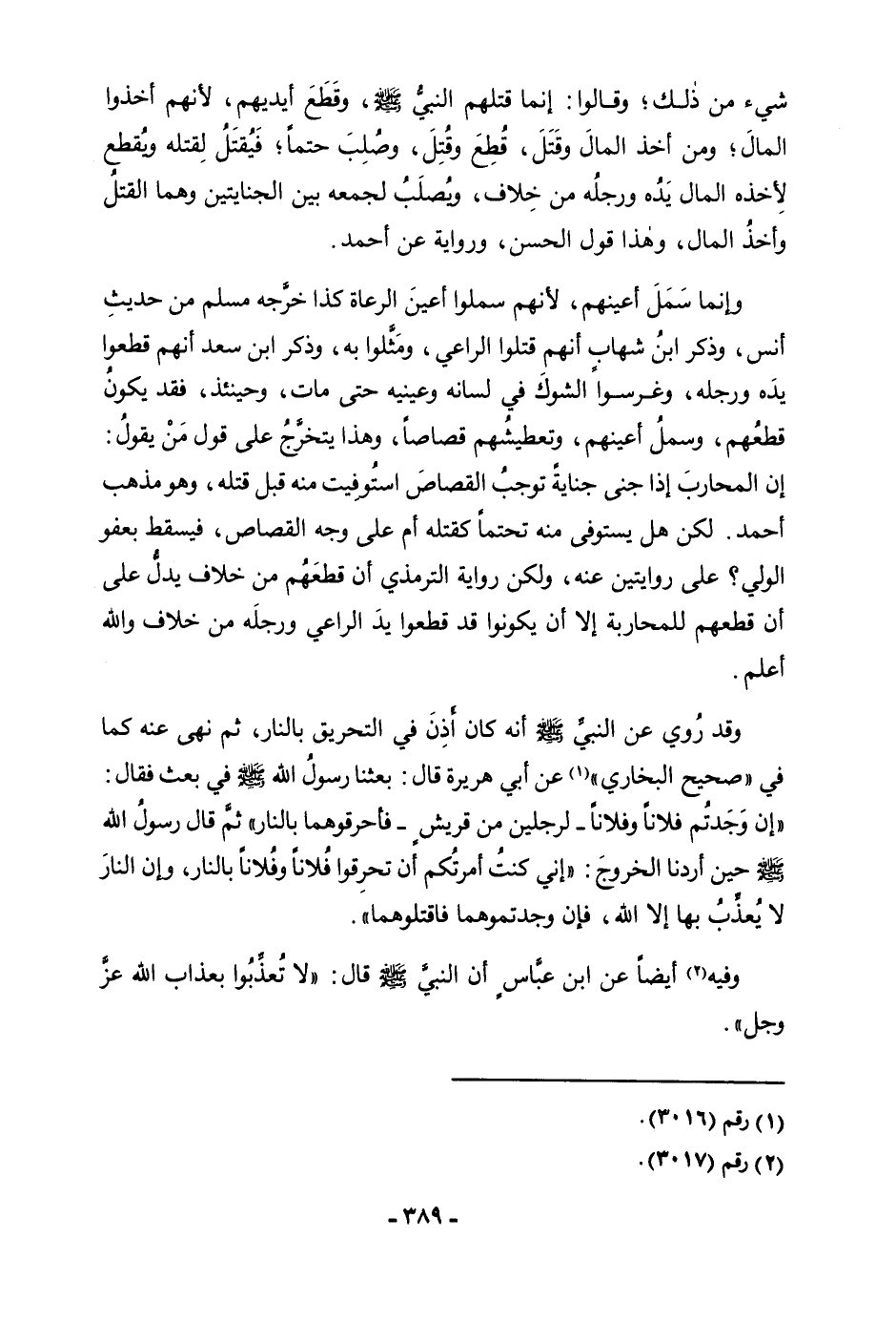 شَيْءٌ مِنْ ذَلِكَ؛ وَقَالُوا: إِنَّمَا قَتَلَهُمُ النَّبِيُّ صَلَّى اللَّهُ عَلَيْهِ وَسَلَّمَ وَقَطَعَ أَيْدِيَهُمْ، لِأَنَّهُمْ أَخَذُوا الْمَالَ؛ وَمَنْ أَخَذَ الْمَالَ وَقَتَلَ، قُطِعَ وَقُتِلَ، وَصُلِبَ حَتْمًا؛ فَيُقْتَلُ لِقَتْلِهِ وَيُقْطَعُ لِأَخْذِهِ الْمَالَ يَدُهُ وَرِجْلُهُ مِنْ خِلَافٍ، وَيُصْلَبُ لِجَمْعِهِ بَيْنَ الْجِنَايَتَيْنِ وَهُمَا الْقَتْلُ وَأَخْذُ الْمَالِ، وَهَذَا قَوْلُ الْحَسَنِ، وَرِوَايَةٌ عَنْ أَحْمَدَ. وَإِنَّمَا سَمَلَ أَعْيُنَهُمْ، لِأَنَّهُمْ سَمَلُوا أَعْيُنَ الرُّعَاةِ كَذَا خَرَّجَهُ مُسْلِمٌ مِنْ حَدِيثِ أَنَسٍ، وَذَكَرَ ابْنُ شِهَابٍ أَنَّهُمْ قَتَلُوا الرَّاعِيَ، وَمَثَّلُوا بِهِ، وَذَكَرَ ابْنُ سَعْدٍ أَنَّهُمْ قَطَعُوا يَدَهُ وَرِجْلَهُ، وَغَرَسُوا الشَّوْكَ فِي لِسَانِهِ وَعَيْنَيْهِ حَتَّى مَاتَ، وَحِينَئِذٍ، فَقَدْ يَكُونُ قَطْعُهُمْ، وَسَمْلُ أَعْيُنِهِمْ، وَتَعْطِيشُهُمْ قِصَاصًا، وَهَذَا يَتَخَرَّجُ عَلَى قَوْلِ مَنْ يَقُولُ: إِنَّ الْمُحَارِبَ إِذَا جَنَى جِنَايَةً تُوجِبُ الْقِصَاصَ اسْتُوْفِيَتْ مِنْهُ قَبْلَ قَتْلِهِ، وَهُوَ مَذْهَبُ أَحْمَدَ. لَكِنْ هَلْ يُسْتَوْفَى مِنْهُ تَحَتُّمًا كَقَتْلِهِ أَمْ عَلَى وَجْهِ الْقِصَاصِ، فَيَسْقُطُ بِعَفْوِ الْوَلِيِّ؟ عَلَى رِوَايَتَيْنِ عَنْهُ، وَلَكِنَّ رِوَايَةَ التِّرْمِذِيَّ أَنَّ قَطْعَهُمْ مِنْ خِلَافٍ يَدُلُّ عَلَى أَنَّ قَطْعَهُمْ لِلْمُحَارَبَةِ إِلَّا أَنْ يَكُونُوا قَدْ قَطَعُوا يَدَ الرَّاعِي وَرِجْلَهُ مِنْ خِلَافٍ وَاللَّهُ أَعْلَمُ. وَقَدْ رُوِيَ «عَنِ النَّبِيِّ صَلَّى اللَّهُ عَلَيْهِ وَسَلَّمَ أَنَّهُ كَانَ أَذِنَ فِي التَّحْرِيقِ بِالنَّارِ، ثُمَّ نَهَى عَنْهُ» كَمَا فِي " صَحِيحِ الْبُخَارِيِّ " عَنْ أَبِي هُرَيْرَةَ قَالَ: «بَعَثَنَا رَسُولُ اللَّهِ صَلَّى اللَّهُ عَلَيْهِ وَسَلَّمَ فِي بَعْثٍ فَقَالَ: إِنْ وَجَدْتُمْ فُلَانًا وَفُلَانًا - لِرَجُلَيْنِ مِنْ قُرَيْشٍ - فَاحْرِقُوهُمَا بِالنَّارِ ثُمَّ قَالَ رَسُولُ اللَّهِ صَلَّى اللَّهُ عَلَيْهِ وَسَلَّمَ حِينَ أَرَدْنَا الْخُرُوجَ: إِنِّي كُنْتُ أَمَرْتُكُمْ أَنْ تَحْرِقُوا فُلَانًا وَفُلَانًا بِالنَّارِ، وَإِنَّ النَّارَ لَا يُعَذِّبُ بِهَا إِلَّا اللَّهُ، فَإِنْ وَجَدْتُمُوهُمَا فَاقْتُلُوهُمَا» . وَفِيهِ أَيْضًا عَنِ ابْنِ عَبَّاسٍ أَنَّ النَّبِيَّ صَلَّى اللَّهُ عَلَيْهِ وَسَلَّمَ قَالَ: «لَا تُعَذِّبُوا بِعَذَابِ اللَّهِ عَزَّ وَجَلَّ» .