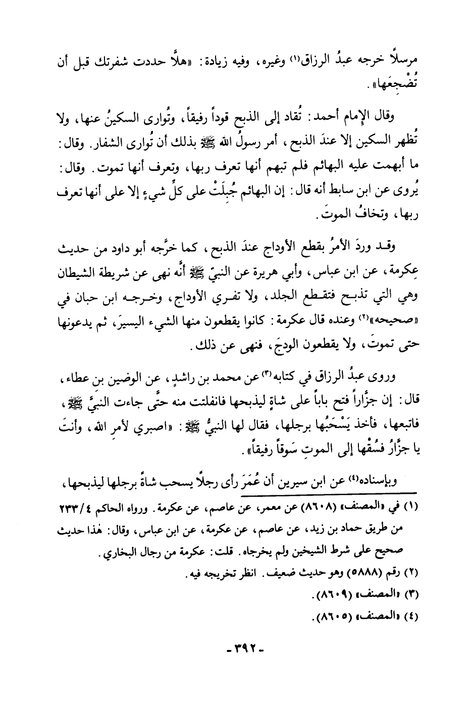 مُرْسَلًا خَرَّجَهُ عَبْدُ الرَّزَّاقِ وَغَيْرُهُ، وَفِيهِ زِيَادَةٌ: " «هَلَّا حَدَدْتَ شَفْرَتَكَ قَبْلَ أَنْ تُضْجِعَهَا» ". وَقَالَ الْإِمَامُ أَحْمَدُ: تُقَادُ إِلَى الذَّبْحِ قَوْدًا رَفِيقًا، وَتُوَارَى السِّكِّينُ عَنْهَا، وَلَا تُظْهَرُ السِّكِّينُ إِلَّا عِنْدَ الذَّبْحِ، أَمَرَ رَسُولُ اللَّهِ صَلَّى اللَّهُ عَلَيْهِ وَسَلَّمَ بِذَلِكَ أَنْ تُوَارَى الشِّفَارُ. وَقَالَ: مَا أُبْهِمَتْ عَلَيْهِ الْبَهَائِمُ فَلَمْ تُبْهَمْ أَنَّهَا تَعْرِفُ رَبَّهَا، وَتَعْرِفُ أَنَّهَا تَمُوتُ. وَقَالَ يُرْوَى عَنِ ابْنِ سَابِطٍ أَنَّهُ قَالَ: إِنَّ الْبَهَائِمَ جُبِلَتْ عَلَى كُلِّ شَيْءٍ إِلَّا أَنَّهَا تَعْرِفُ رَبَّهَا، وَتَخَافُ الْمَوْتَ.