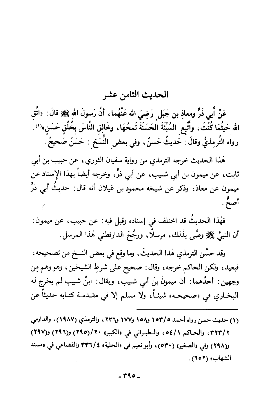 الْحَدِيثُ الثَّامِنَ عَشَرَ عَنْ أَبِي ذَرٍّ وَمُعَاذِ بْنِ جَبَلٍ رَضِيَ اللَّهُ عَنْهُمَا، أَنَّ رَسُولَ اللَّهِ صَلَّى اللَّهُ عَلَيْهِ وَسَلَّمَ قَالَ: «اتَّقِ اللَّهَ حَيْثُمَا كُنْتَ، وَأَتْبِعِ السَّيِّئَةَ الْحَسَنَةَ تَمْحُهَا، وَخَالِقِ النَّاسَ بِخُلُقٍ حَسَنٍ» رَوَاهُ التِّرْمِذِيُّ وَقَالَ: حَدِيثٌ حَسَنٌ، وَفِي بَعْضِ النُّسَخِ: حَسَنٌ صَحِيحٌ.