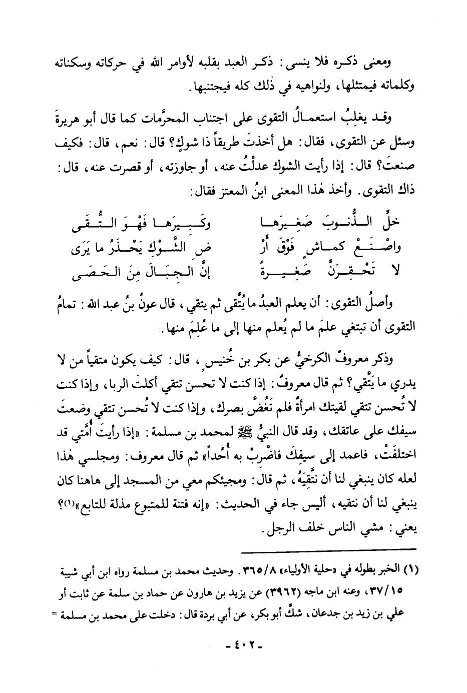 وَأَصْلُ التَّقْوَى: أَنْ يَعْلَمَ الْعَبْدُ مَا يُتَّقَى ثُمَّ يَتَّقِي، قَالَ عَوْنُ بْنُ عَبْدِ اللَّهِ: تَمَامُ التَّقْوَى أَنْ تَبْتَغِيَ عِلْمَ مَا لَمْ يُعْلَمُ مِنْهَا إِلَى مَا عُلِمَ مِنْهَا. وَذَكَرَ مَعْرُوفٌ الْكَرْخِيُّ عَنْ بَكْرِ بْنِ خُنَيْسٍ، قَالَ: كَيْفَ يَكُونُ مُتَّقِيًا مَنْ لَا يَدْرِي مَا يَتَّقِي؟ ثُمَّ قَالَ مَعْرُوفٌ: إِذَا كُنْتَ لَا تُحْسِنُ تَتَّقِي أَكَلْتَ الرِّبَا، وَإِذَا كُنْتَ لَا تُحْسِنُ تَتَّقِي لَقِيَتْكَ امْرَأَةٌ فَلَمْ تَغُضَّ بَصَرَكَ، وَإِذَا كُنْتَ لَا تُحْسِنُ تَتَّقِي وَضَعْتَ سَيْفَكَ عَلَى عَاتِقِكَ، وَقَدْ قَالَ النَّبِيُّ صَلَّى اللَّهُ عَلَيْهِ وَسَلَّمَ لِمُحَمَّدِ بْنِ مَسْلَمَةَ: «إِذَا رَأَيْتَ أُمَّتِي قَدِ اخْتَلَفَتْ، فَاعْمَدْ إِلَى سَيْفِكَ فَاضْرِبْ بِهِ أُحُدًا» ثُمَّ قَالَ مَعْرُوفٌ: وَمَجْلِسِي هَذَا لَعَلَّهُ كَانَ يَنْبَغِي لَنَا أَنْ نَتَّقِيَهُ، ثُمَّ قَالَ: وَمَجِيئُكُمْ مَعِي مِنَ الْمَسْجِدِ إِلَى هَاهُنَا كَانَ يَنْبَغِي لَنَا أَنْ نَتَّقِيَهُ، أَلَيْسَ جَاءَ فِي الْحَدِيثِ: " «إِنَّهُ فِتْنَةٌ لِلْمَتْبُوعِ مَذَلَّةٌ لِلتَّابِعِ» "؟ يَعْنِي: مَشْيَ النَّاسِ خَلْفَ الرَّجُلِ.