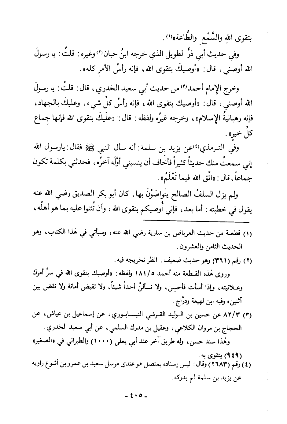 بِتَقْوَى اللَّهِ وَالسَّمْعِ وَالطَّاعَةِ» . وَفِي حَدِيثِ أَبِي ذَرٍّ الطَّوِيلِ الَّذِي خَرَّجَهُ ابْنُ حِبَّانَ وَغَيْرُهُ: «قُلْتُ: يَا رَسُولَ اللَّهِ أَوْصِنِي، قَالَ: أُوصِيكَ بِتَقْوَى اللَّهِ، فَإِنَّهُ رَأْسُ الْأَمْرِ كُلِّهِ» . وَخَرَّجَ الْإِمَامُ أَحْمَدُ مِنْ حَدِيثِ «أَبِي سَعِيدٍ الْخُدْرِيِّ، قَالَ: قُلْتُ: يَا رَسُولَ اللَّهِ أَوْصِنِي، قَالَ: أُوصِيكَ بِتَقْوَى اللَّهِ، فَإِنَّهُ رَأْسُ كُلِّ شَيْءٍ، وَعَلَيْكَ بِالْجِهَادِ، فَإِنَّهُ رَهْبَانِيَّةُ الْإِسْلَامِ» ، وَخَرَّجَهُ غَيْرُهُ وَلَفْظُهُ: قَالَ: " «عَلَيْكَ بِتَقْوَى اللَّهِ فَإِنَّهُ جِمَاعُ كُلِّ خَيْرٍ» ". وَفِي التِّرْمِذِيِّ عَنْ يَزِيدَ بْنِ سَلَمَةَ: أَنَّهُ «سَأَلَ النَّبِيَّ صَلَّى اللَّهُ عَلَيْهِ وَسَلَّمَ فَقَالَ: يَا رَسُولَ اللَّهِ إِنِّي سَمِعْتُ مِنْكَ حَدِيثًا كَثِيرًا فَأَخَافُ أَنْ يُنْسِيَنِي أَوَّلَهُ آخِرُهُ، فَحَدِّثْنِي بِكَلِمَةٍ تَكُونُ جِمَاعًا، قَالَ: اتَّقِ اللَّهَ فِيمَا تَعْلَمُ» . وَلَمْ يَزَلِ السَّلَفُ الصَّالِحُ يَتَوَاصَوْنَ بِهَا، كَانَ أَبُو بَكْرٍ الصِّدِّيقُ رَضِيَ اللَّهُ عَنْهُ يَقُولُ فِي خُطْبَتِهِ: أَمَّا بَعْدُ، فَإِنِّي أُوصِيكُمْ بِتَقْوَى اللَّهِ، وَأَنْ تُثْنُوا عَلَيْهِ بِمَا هُوَ أَهْلُهُ،