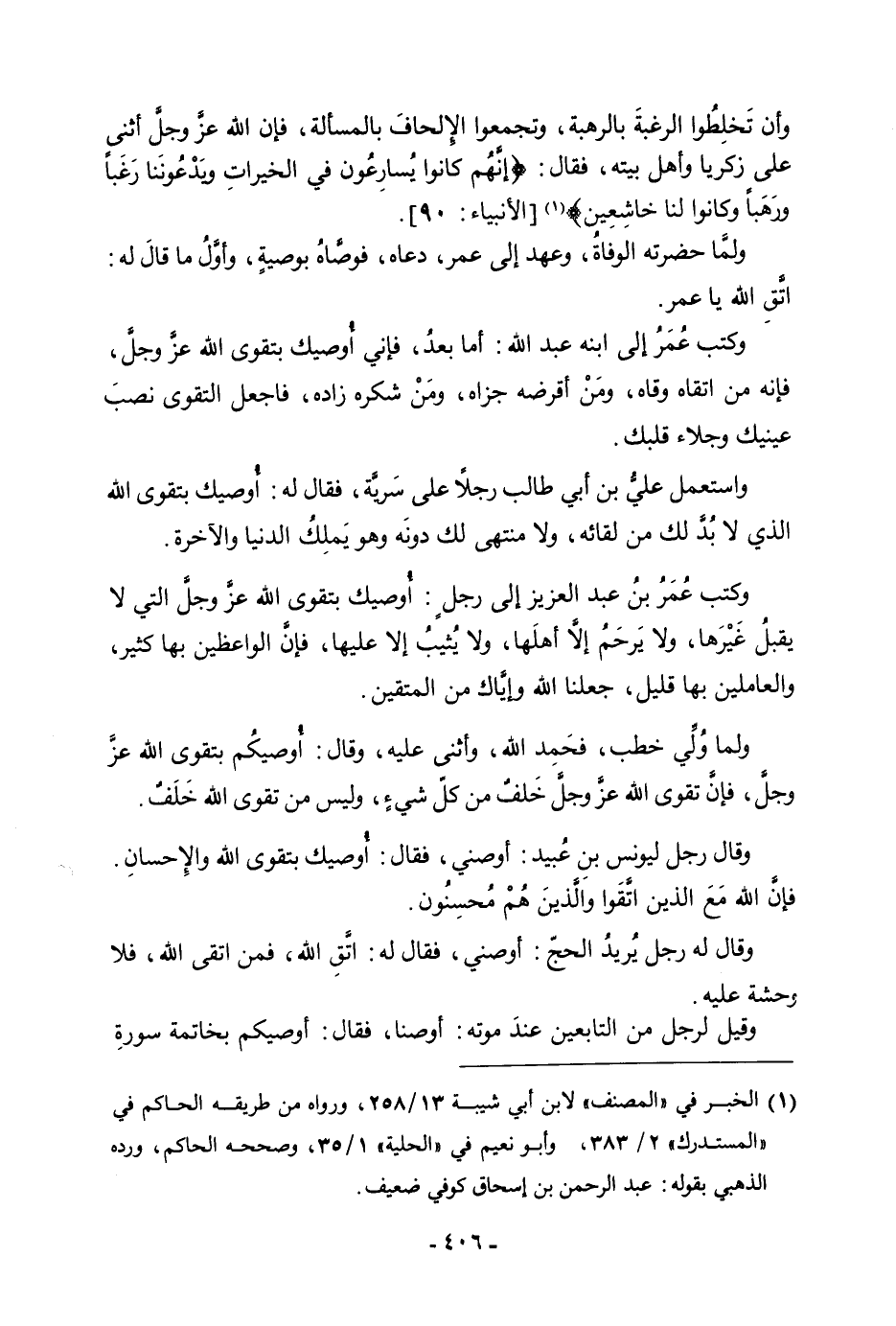 وَأَنْ تَخْلِطُوا الرَّغْبَةَ بِالرَّهْبَةِ، وَتَجْمَعُوا الْإِلْحَافَ بِالْمَسْأَلَةِ، فَإِنَّ اللَّهَ عَزَّ وَجَلَّ أَثْنَى عَلَى زَكَرِيَّا وَأَهْلِ بَيْتِهِ، فَقَالَ: {إِنَّهُمْ كَانُوا يُسَارِعُونَ فِي الْخَيْرَاتِ وَيَدْعُونَنَا رَغَبًا وَرَهَبًا وَكَانُوا لَنَا خَاشِعِينَ} [الأنبياء: 90] [الْأَنْبِيَاءِ: 90] . وَلَمَّا حَضَرَتْهُ الْوَفَاةُ، وَعَهِدَ إِلَى عُمَرَ، دَعَاهُ، فَوَصَّاهُ بِوَصِيَّتِهِ، وَأَوَّلُ مَا قَالَ لَهُ: اتَّقِ اللَّهَ يَا عُمَرُ. وَكَتَبَ عُمَرُ إِلَى ابْنِهِ عَبْدِ اللَّهِ: أَمَّا بَعْدُ، فَإِنِّي أُوصِيكَ بِتَقْوَى اللَّهِ عَزَّ وَجَلَّ، فَإِنَّهُ مَنِ اتَّقَاهُ وَقَاهُ، وَمَنْ أَقْرَضَهُ جَزَاهُ، وَمَنْ شَكَرَهُ زَادَهُ، وَاجْعَلِ التَّقْوَى نُصْبَ عَيْنَيْكَ وَجَلَاءَ قَلْبِكَ. وَاسْتَعْمَلَ عَلِيُّ بْنُ أَبِي طَالِبٍ رَجُلًا عَلَى سَرِيَّةٍ، فَقَالَ لَهُ: أُوصِيكَ بِتَقْوَى اللَّهِ الَّذِي لَابُدَّ لَكَ مِنْ لِقَائِهِ، وَلَا مُنْتَهَى لَكَ دُونَهُ وَهُوَ يَمْلِكُ الدُّنْيَا وَالْآخِرَةَ. وَكَتَبَ عُمَرُ بْنُ عَبْدِ الْعَزِيزِ إِلَى رَجُلٍ: أُوصِيكَ بِتَقْوَى اللَّهِ عَزَّ وَجَلَّ الَّتِي لَا يَقْبَلُ غَيْرَهَا، وَلَا يَرْحَمُ إِلَّا أَهْلَهَا، وَلَا يُثِيبُ إِلَّا عَلَيْهَا، فَإِنَّ الْوَاعِظِينَ بِهَا كَثِيرٌ، وَالْعَامِلِينَ بِهَا قَلِيلٌ، جَعَلَنَا اللَّهُ وَإِيَّاكَ مِنَ الْمُتَّقِينَ. وَلَمَّا وُلِّىَ خَطَبَ، فَحَمِدَ اللَّهَ، وَأَثْنَى عَلَيْهِ، وَقَالَ: أُوصِيكُمْ بِتَقْوَى اللَّهِ عَزَّ وَجَلَّ، فَإِنَّ تَقْوَى اللَّهِ عَزَّ وَجَلَّ خَلَفٌ مِنْ كُلِّ شَيْءٍ، وَلَيْسَ مِنْ تَقْوَى اللَّهِ خَلَفٌ. وَقَالَ رَجُلٌ لِيُونُسَ بْنِ عُبَيْدٍ: أَوْصِنِي، فَقَالَ: أُوصِيكَ بِتَقْوَى اللَّهِ وَالْإِحْسَانِ. فَإِنَّ اللَّهَ مَعَ الَّذِينَ اتَّقَوْا وَالَّذِينَ هُمْ مُحْسِنُونَ. وَقَالَ لَهُ رَجُلٌ يُرِيدُ الْحَجَّ: أَوْصِنِي، فَقَالَ لَهُ: اتَّقِ اللَّهَ، فَمَنِ اتَّقَى اللَّهَ، فَلَا وَحْشَةَ عَلَيْهِ. وَقِيلَ لِرَجُلٍ مِنَ التَّابِعِينَ عِنْدَ مَوْتِهِ: أَوْصِنَا، فَقَالَ: أُوصِيكُمْ بِخَاتِمَةِ سُورَةِ