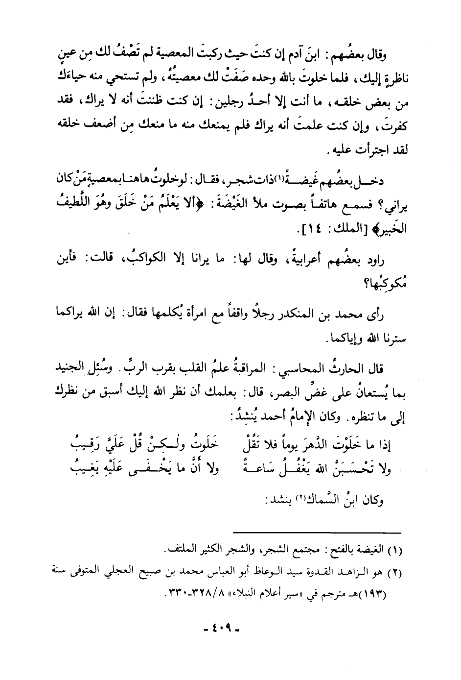 وَقَالَ بَعْضُهُمْ: ابْنَ آدَمَ إِنْ كُنْتَ حَيْثُ رَكِبْتَ الْمَعْصِيَةَ لَمْ تَصْفُ لَكَ مِنْ عَيْنٍ نَاظِرَةٍ إِلَيْكَ، فَلَمَّا خَلَوْتَ بِاللَّهِ وَحْدَهُ صَفَتْ لَكَ مَعْصِيَتُهُ، وَلَمْ تَسْتَحْيِ مِنْهُ حَيَاءَكَ مِنْ بَعْضِ خَلْقِهِ، مَا أَنْتَ إِلَّا أَحَدُ رَجُلَيْنِ: إِنْ كُنْتَ ظَنَنْتَ أَنَّهُ لَا يَرَاكَ، فَقَدْ كَفَرْتَ، وَإِنْ كُنْتَ عَلِمْتَ أَنَّهُ يَرَاكَ فَلَمْ يَمْنَعْكَ مِنْهُ مَا مَنَعَكَ مِنْ أَضْعَفِ خَلْقِهِ لَقَدِ اجْتَرَأْتَ عَلَيْهِ. دَخَلَ بَعْضُهُمْ غَيْضَةً ذَاتَ شَجَرٍ، فَقَالَ: لَوْ خَلَوْتُ هَاهُنَا بِمَعْصِيَةِ مَنْ كَانَ يَرَانِي؟ فَسَمِعَ هَاتِفًا بِصَوْتٍ مَلَأَ الْغَيْضَةَ: {أَلَا يَعْلَمُ مَنْ خَلَقَ وَهُوَ اللَّطِيفُ الْخَبِيرُ} [الملك: 14] [الْمُلْكِ: 14] . رَاوَدَ بَعْضُهُمْ أَعْرَابِيَّةً، وَقَالَ لَهَا: مَا يَرَانَا إِلَّا الْكَوَاكِبُ، قَالَتْ: أَيْنَ مُكَوْكِبُهَا؟ . رَأَى مُحَمَّدُ بْنُ الْمُنْكَدِرِ رَجُلًا وَاقِفًا مَعَ امْرَأَةٍ يُكَلِّمُهَا فَقَالَ: إِنَّ اللَّهَ يَرَاكُمَا سَتَرَنَا اللَّهُ وَإِيَّاكُمَا. وَقَالَ الْحَارِثُ الْمُحَاسِبِيُّ: الْمُرَاقَبَةُ عِلْمُ الْقَلْبِ بِقُرْبِ الرَّبِّ. وَسُئِلَ الْجُنَيْدُ بِمَ يُسْتَعَانُ عَلَى غَضِّ الْبَصَرِ، قَالَ بِعِلْمِكَ أَنَّ نَظَرَ اللَّهِ إِلَيْكَ أَسْبَقُ مِنْ نَظَرِكَ إِلَى مَا تَنْظُرُهُ. وَكَانَ الْإِمَامُ أَحْمَدُ يُنْشِدُ:
