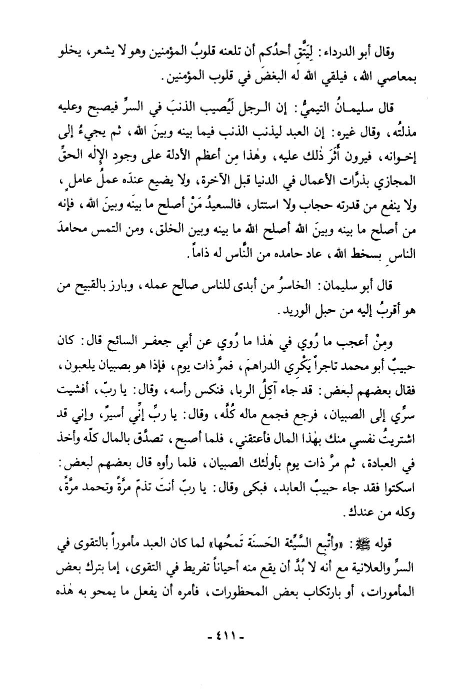 وَقَالَ أَبُو الدَّرْدَاءِ: لِيَتَّقِ أَحَدُكُمْ أَنْ تَلْعَنَهُ قُلُوبُ الْمُؤْمِنِينَ وَهُوَ لَا يَشْعُرُ، يَخْلُو بِمَعَاصِي اللَّهِ، فَيُلْقِي اللَّهُ لَهُ الْبُغْضَ فِي قُلُوبِ الْمُؤْمِنِينَ. وَقَالَ سُلَيْمَانُ التَّيْمِيُّ: إِنَّ الرَّجُلَ لَيُصِيبُ الذَّنْبَ فِي السِّرِّ فَيُصْبِحُ وَعَلَيْهِ مَذَلَّتُهُ، وَقَالَ غَيْرُهُ: إِنَّ الْعَبْدَ لِيُذْنِبُ الذَّنْبَ فِيمَا بَيْنَهُ وَبَيْنَ اللَّهِ، ثُمَّ يَجِيءُ إِلَى إِخْوَانِهِ، فَيَرَوْنَ أَثَرَ ذَلِكَ عَلَيْهِ، وَهَذَا مِنْ أَعْظَمِ الْأَدِلَّةِ عَلَى وُجُودِ الْإِلَهِ الْحَقِّ الْمُجَازِي بِذَرَّاتِ الْأَعْمَالِ فِي الدُّنْيَا قَبْلَ الْآخِرَةِ، وَلَا يَضِيعُ عِنْدَهُ عَمَلُ عَامِلٍ، وَلَا يَنْفَعُ مِنْ قُدْرَتِهِ حِجَابٌ وَلَا اسْتِتَارٌ، فَالسَّعِيدُ مَنْ أَصْلَحَ مَا بَيْنَهُ وَبَيْنَ اللَّهِ، فَإِنَّهُ مَنْ أَصْلَحَ مَا بَيْنَهُ وَبَيْنَ اللَّهِ أَصْلَحَ اللَّهُ مَا بَيْنَهُ وَبَيْنَ الْخَلْقِ، وَمَنِ الْتَمَسَ مَحَامِدَ النَّاسِ بِسُخْطِ اللَّهِ، عَادَ حَامِدُهُ مِنَ النَّاسِ ذَامًّا لَهُ. قَالَ أَبُو سُلَيْمَانَ: إِنَّ الْخَاسِرَ مَنْ أَبْدَى لِلنَّاسِ صَالِحَ عَمَلِهِ، وَبَارَزَ بِالْقَبِيحِ مَنْ هُوَ أَقْرَبُ إِلَيْهِ مِنْ حَبْلِ الْوَرِيدِ. وَمِنْ أَعْجَبِ مَا رُوِيَ فِي هَذَا مَا رُوِيَ عَنْ أَبِي جَعْفَرٍ السَّائِحِ قَالَ: كَانَ حَبِيبٌ أَبُو مُحَمَّدٍ تَاجِرًا يَكْرِي الدَّرَاهِمَ، فَمَرَّ ذَاتَ يَوْمٍ، فَإِذَا هُوَ بِصِبْيَانٍ يَلْعَبُونَ، فَقَالَ بَعْضُهُمْ لِبَعْضٍ: قَدْ جَاءَ آكِلُ الرِّبَا، فَنَكَّسَ رَأْسَهُ، وَقَالَ: يَا رَبِّ، أَفْشَيْتَ سِرِّي إِلَى الصِّبْيَانِ، فَرَجَعَ فَجَمَعَ مَالَهُ كُلَّهُ، وَقَالَ: يَا رَبِّ إِنِّي أَسِيرٌ، وَإِنِّي قَدِ اشْتَرَيْتُ نَفْسِي مِنْكَ بِهَذَا الْمَالِ فَأَعْتِقْنِي، فَلَمَّا أَصْبَحَ تَصَدَّقَ بِالْمَالِ كُلِّهِ وَأَخَذَ فِي الْعِبَادَةِ، ثُمَّ مَرَّ ذَاتَ يَوْمٍ بِأُولَئِكَ الصِّبْيَانِ، فَلَمَّا رَأَوْهُ قَالَ بَعْضُهُمْ لِبَعْضٍ: اسْكُتُوا فَقَدْ جَاءَ حَبِيبٌ الْعَابِدُ، فَبَكَى وَقَالَ: يَا رَبِّ أَنْتَ تَذُمُّ مَرَّةً وَتَحْمَدُ مَرَّةً، وَكُلُّهُ مِنْ عِنْدِكَ.