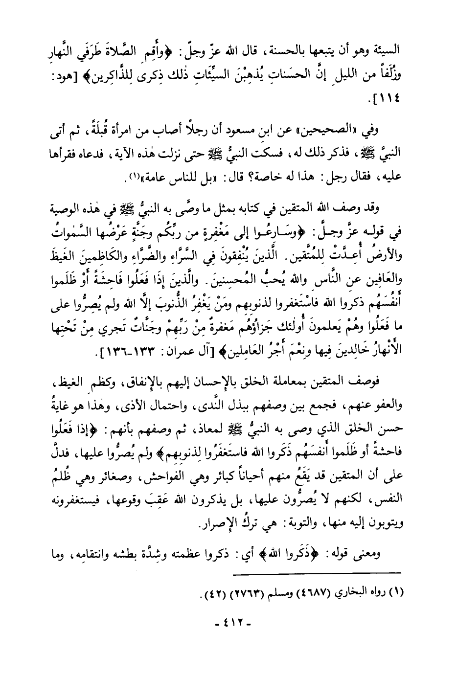 السَّيِّئَةَ وَهُوَ أَنْ يُتْبِعَهَا بِالْحَسَنَةِ، قَالَ اللَّهُ عَزَّ وَجَلَّ: {وَأَقِمِ الصَّلَاةَ طَرَفَيِ النَّهَارِ وَزُلَفًا مِنَ اللَّيْلِ إِنَّ الْحَسَنَاتِ يُذْهِبْنَ السَّيِّئَاتِ ذَلِكَ ذِكْرَى لِلذَّاكِرِينَ} [هود: 114] [هُودٍ: 114] . وَفِي " الصَّحِيحَيْنِ " عَنِ ابْنِ مَسْعُودٍ «أَنَّ رَجُلًا أَصَابَ مِنِ امْرَأَةٍ قُبْلَةً، ثُمَّ أَتَى النَّبِيَّ صَلَّى اللَّهُ عَلَيْهِ وَسَلَّمَ، فَذَكَرَ ذَلِكَ لَهُ، فَسَكَتَ النَّبِيُّ صَلَّى اللَّهُ عَلَيْهِ وَسَلَّمَ حَتَّى نَزَلَتْ هَذِهِ الْآيَةُ، فَدَعَاهُ فَقَرَأَهَا عَلَيْهِ، فَقَالَ رَجُلٌ: هَذَا لَهُ خَاصَّةً؟ قَالَ: " بَلْ لِلنَّاسِ عَامَّةً» . وَقَدْ وَصَفَ اللَّهُ الْمُتَّقِينَ فِي كِتَابِهِ بِمِثْلِ مَا وَصَّى بِهِ النَّبِيُّ صَلَّى اللَّهُ عَلَيْهِ وَسَلَّمَ فِي هَذِهِ الْوَصِيَّةِ فِي قَوْلِهِ عَزَّ وَجَلَّ {وَسَارِعُوا إِلَى مَغْفِرَةٍ مِنْ رَبِّكُمْ وَجَنَّةٍ عَرْضُهَا السَّمَاوَاتُ وَالْأَرْضُ أُعِدَّتْ لِلْمُتَّقِينَ - الَّذِينَ يُنْفِقُونَ فِي السَّرَّاءِ وَالضَّرَّاءِ وَالْكَاظِمِينَ الْغَيْظَ وَالْعَافِينَ عَنِ النَّاسِ وَاللَّهُ يُحِبُّ الْمُحْسِنِينَ - وَالَّذِينَ إِذَا فَعَلُوا فَاحِشَةً أَوْ ظَلَمُوا أَنْفُسَهُمْ ذَكَرُوا اللَّهَ فَاسْتَغْفَرُوا لِذُنُوبِهِمْ وَمَنْ يَغْفِرُ الذُّنُوبَ إِلَّا اللَّهُ وَلَمْ يُصِرُّوا عَلَى مَا فَعَلُوا وَهُمْ يَعْلَمُونَ - أُولَئِكَ جَزَاؤُهُمْ مَغْفِرَةٌ مِنْ رَبِّهِمْ وَجَنَّاتٍ تَجْرِي مِنْ تَحْتِهَا الْأَنْهَارُ خَالِدِينَ فِيهَا وَنِعْمَ أَجْرُ الْعَامِلِينَ} [آل عمران: 133 - 136] [آلِ عِمْرَانَ: 133 - 136] . فَوَصَفَ الْمُتَّقِينَ بِمُعَامَلَةِ الْخَلْقِ بِالْإِحْسَانِ إِلَيْهِمْ بِالْإِنْفَاقِ، وَكَظْمِ الْغَيْظِ، وَالْعَفْوِ عَنْهُمْ، فَجَمَعَ بَيْنَ وَصْفِهِمْ بِبَذْلِ النَّدَى، وَاحْتِمَالِ الْأَذَى، وَهَذَا هُوَ غَايَةُ حُسْنِ الْخُلُقِ الَّذِي وَصَّى بِهِ النَّبِيُّ صَلَّى اللَّهُ عَلَيْهِ وَسَلَّمَ لِمُعَاذٍ، ثُمَّ وَصَفَهُمْ بِأَنَّهُمْ: {إِذَا فَعَلُوا فَاحِشَةً أَوْ ظَلَمُوا أَنْفُسَهُمْ ذَكَرُوا اللَّهَ فَاسْتَغْفَرُوا لِذُنُوبِهِمْ} [آل عمران: 135] وَلَمْ يُصِرُّوا عَلَيْهَا، فَدَلَّ عَلَى أَنَّ الْمُتَّقِينَ قَدْ يَقَعُ مِنْهُمْ أَحْيَانًا كَبَائِرُ وَهِيَ الْفَوَاحِشُ، وَصَغَائِرُ وَهِيَ ظُلْمُ النَّفْسِ، لَكِنَّهُمْ لَا يُصِرُّونَ عَلَيْهَا، بَلْ يَذْكُرُونَ اللَّهَ عَقِبَ وُقُوعِهَا، فَيَسْتَغْفِرُونَهُ وَيَتُوبُونَ إِلَيْهِ مِنْهَا، وَالتَّوْبَةُ: هِيَ تَرْكُ الْإِصْرَارِ. وَمَعْنَى قَوْلِهِ: {ذَكَرُوا اللَّهَ} [آل عمران: 135] أَيْ: ذَكَرُوا عَظَمَتَهُ وَشِدَّةَ بَطْشِهِ وَانْتِقَامِهِ، وَمَا