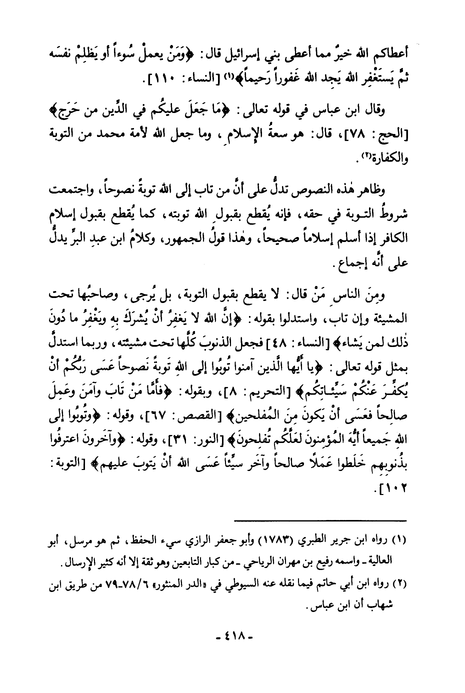 أَعْطَاكُمُ اللَّهُ خَيْرٌ مِمَّا أَعْطَى بَنِي إِسْرَائِيلَ قَالَ: {وَمَنْ يَعْمَلْ سُوءًا أَوْ يَظْلِمْ نَفْسَهُ ثُمَّ يَسْتَغْفِرِ اللَّهَ يَجِدِ اللَّهَ غَفُورًا رَحِيمًا} [النساء: 110] [النِّسَاءِ: 110] » ، وَقَالَ ابْنُ عَبَّاسٍ فِي قَوْلِهِ تَعَالَى: {مَا جَعَلَ عَلَيْكُمْ فِي الدِّينِ مِنْ حَرَجٍ} [الحج: 78] [الْحَجِّ: 78] ، قَالَ: هُوَ سَعَةُ الْإِسْلَامِ، وَمَا جَعَلَ اللَّهُ لِأُمَّةِ مُحَمَّدٍ مِنَ التَّوْبَةِ وَالْكَفَّارَةِ. وَظَاهِرُ هَذِهِ النُّصُوصِ يَدُلُّ عَلَى أَنَّ مَنْ تَابَ إِلَى اللَّهِ تَوْبَةً نَصُوحًا، وَاجْتَمَعَتْ شُرُوطُ التَّوْبَةِ فِي حَقِّهِ، فَإِنَّهُ يُقْطَعُ بِقَبُولِ اللَّهِ تَوْبَتَهُ، كَمَا يُقْطَعُ بِقَبُولِ إِسْلَامِ الْكَافِرِ إِذَا أَسْلَمَ إِسْلَامًا صَحِيحًا، وَهَذَا قَوْلُ الْجُمْهُورِ، وَكَلَامُ ابْنِ عَبْدِ الْبَرِّ يَدُلُّ عَلَى أَنَّهُ إِجْمَاعٌ. وَمِنَ النَّاسِ مَنْ قَالَ: لَا يُقْطَعُ بِقَبُولِ التَّوْبَةِ، بَلْ يُرْجَى وَصَاحِبُهَا تَحْتَ الْمَشِيئَةِ وَإِنْ تَابَ، وَاسْتَدَلُّوا بِقَوْلِهِ: {إِنَّ اللَّهَ لَا يَغْفِرُ أَنْ يُشْرَكَ بِهِ وَيَغْفِرُ مَا دُونَ ذَلِكَ لِمَنْ يَشَاءُ} [النساء: 48] [النِّسَاءِ: 48] فَجَعَلَ الذُّنُوبَ كُلَّهَا تَحْتَ مَشِيئَتِهِ، وَرُبَّمَا اسْتَدَلَّ بِمِثْلِ قَوْلِهِ تَعَالَى: {يَا أَيُّهَا الَّذِينَ آمَنُوا تُوبُوا إِلَى اللَّهِ تَوْبَةً نَصُوحًا عَسَى رَبُّكُمْ أَنْ يُكَفِّرَ عَنْكُمْ سَيِّئَاتِكُمْ} [التحريم: 8] [التَّحْرِيمِ: 8] ، وَبِقَوْلِهِ: {فَأَمَّا مَنْ تَابَ وَآمَنَ وَعَمِلَ صَالِحًا فَعَسَى أَنْ يَكُونَ مِنَ الْمُفْلِحِينَ} [القصص: 67] [الْقَصَصِ: 67] ، وَقَوْلِهِ: {وَتُوبُوا إِلَى اللَّهِ جَمِيعًا أَيُّهَا الْمُؤْمِنُونَ لَعَلَّكُمْ تُفْلِحُونَ} [النور: 31] [النُّورِ: 31] ، وَقَوْلِهِ: {وَآخَرُونَ اعْتَرَفُوا بِذُنُوبِهِمْ خَلَطُوا عَمَلًا صَالِحًا وَآخَرَ سَيِّئًا عَسَى اللَّهُ أَنْ يَتُوبَ عَلَيْهِمْ} [التوبة: 102] [التَّوْبَةِ: 102] .