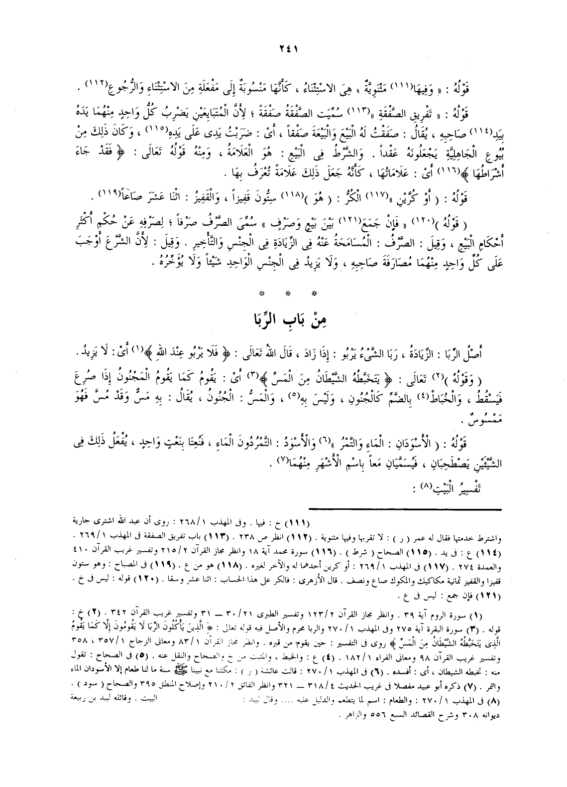 (¬3) سورة البقرة آية 275 وفى المهذب 1/ 270 والربا محرم والأصل فيه قوله تعالى: {الَّذِينَ يَأْكُلُونَ الرِّبَا لَا يَقُومُونَ إِلَّا كَمَا يَقُومُ الَّذِي يَتَخَبَّطُهُ الشَّيْطَانُ مِنَ الْمَسِّ} روى فى التفسير: حين يقوم من قبره. وانظر مجاز القرآن 1/ 83 ومعانى الزجاج 1/ 357، 358 وتفسير غريب القرآن 98 ومعانى الفراء 1/ 182.