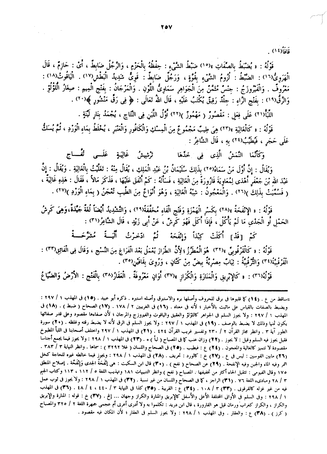 قَوْلُهُ: "يُضْبَطُ بِالصِّفَاتِ" (¬15) ضَبْطُ الشَّىْءِ: حِفْظُهُ بِالْحَزْمِ، وَالرَّجُلُ ضَابِطٌ، أَىْ: حَازِمٌ، قَالَ الْهَرَوِىُّ (¬16): الضَّبْطُ: لُزُومُ الشَّىْءِ بِقُوَّةٍ، وَرَجُلٌ ضَابِطٌ: قَوِىُّ شَدِيدُ الْبَطْشِ (¬17). الْيَاقُوتُ (¬18): مَعْرُوفٌ. وَالْفَيْروزَجُ: جِنْسٌ مُثَمَّنٌ مِنَ الْجَوَاهِرِ سَمَاوِىُّ اللَّوْنِ. وَالْمَرْجَانُ: بِفَتْحِ المِيمِ: صِغَارُ الُّلؤْلُؤِ. وَالرَّقُّ (¬19): بِفَتْحِ الرَّاءِ: جِلْدٌ رَقِيقٌ يُكْتَبُ عَلَيْهِ، قَالَ اللهُ تَعَالَى: {فِي رَقٍّ مَنْشُورٍ} (¬20).