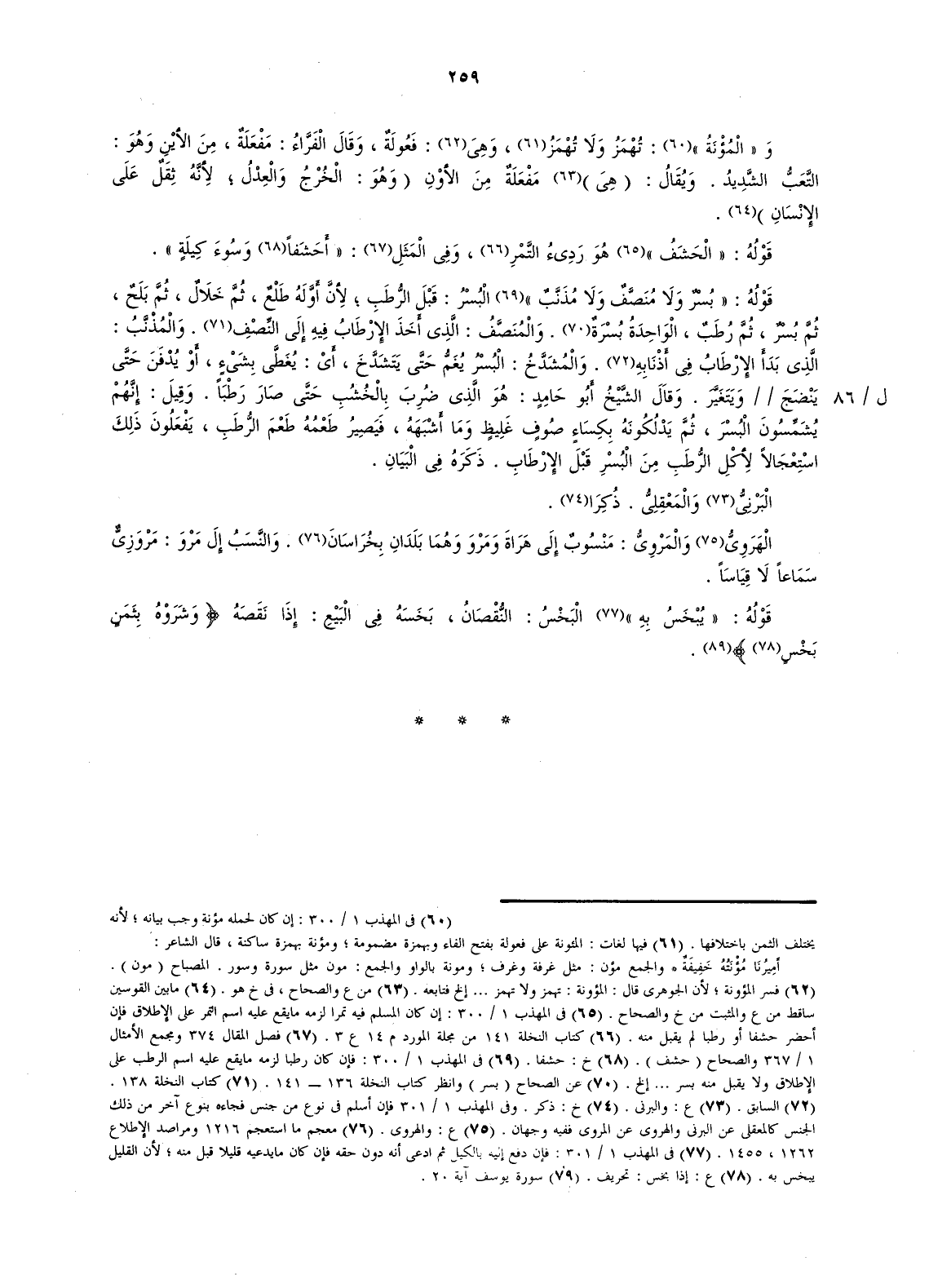 قَوْلُهُ: "بُسْرٌ وَلَا مُنَصَّفٌ وَلَا مُذَنَّبٌ" (¬69) الْبُسْرُ: قَبْلَ الرُّطَبِ؛ لِأنَّ أوَّلَهُ طَلْعٌ، ثُمَّ خَلَالٌ، ثُمَّ بَلَحٌ، ثُم بُسْرٌ، ثُمّ رُطَبٌ، الْوَاحِدَةُ بُسْرَةٌ (¬70). وَالْمُنَصَّفُ: الَّذِى أَخَذَ الِإرْطَابُ فِيهِ إلَى النِّصْفِ (¬71). وَالْمُذْنَّبُ: الَّذِى بَدَأَ الإرْطَابُ فِى أَذْنَابِهِ (¬72). وَالْمُشَدَّخُ: الْبُسْرُ يُغَمُّ حَتَّى يَتَشَدَّخَ، أَىْ: يُغَطَّى بِشَىْءٍ، أو يُدْفَنَ حَتَّى يَنْضَجَ وَيَتَغَيَّرَ. وَقاَلَ الشَّيْخُ أَبُو حَامِدٍ: هُوَ الَّذِى ضُرِبَ بِالْخُشُبِ حَتَّى صَارَ رَطْبًا. وَقِيلَ: إِنَّهُمْ يُشَمِّسُونَ الْبُسْرَ، ثُمَّ يَدْلُكُونَهُ بِكِسَاءٍ صُوفٍ غَلِيظٍ وَمَا أَشْبَهَهُ، فَيَصِيرُ طَعْمُهُ طَعْمَ الرُّطَبِ، يَفْعَلُونَ ذلِكَ اسْتِعْجَالًا لِأكْلِ الرُّطَبِ مِنَ الْبُسْرِ قَبْلَ الِإرْطَابِ. ذَكَرَهُ فى الْبَيَانِ.