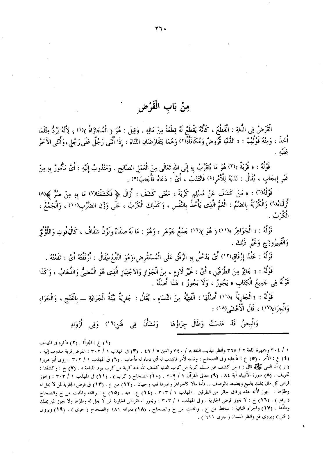الْقَرْضُ فى اللُّغَةِ: الْقَطْعُ، كَأَنَّهُ يَقْطَع لَهُ قِطْعَةً مِنْ مَالِهِ. وَقِيلَ: هُوَ (الْمُجَازَاةُ) (¬1)؛ لِأَنَّهُ يَرُدُّ مِثْلَمَا أَخَذَ، وَمِنْهُ قَوْلُهُمْ: "الدُّنْيَا قُرُوضٌ وَمُكَافَأَةً (¬2) وَهُمَا يَتَقَارَضَانِ الثَّنَاءَ: إِذَا أَثْنَى رَجُلٌ عَلَى رَجُلٍ، وَأَثْنَى الآخَرُ عَلَيْهِ.