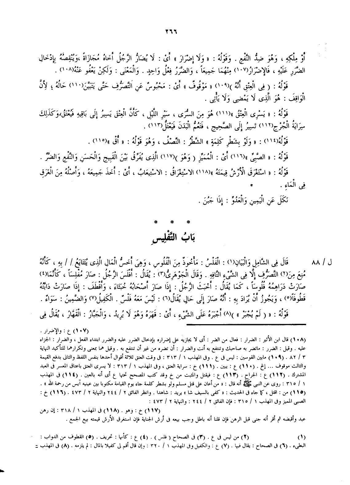 قَالَ فِى الشَّامِلِ وَالْبَيَانِ (¬1): الْفَلْسُ: مَأْخُوذٌ مِنَ الْفُلُوس، وَهِىَ أَخَسُّ الْمَالِ الَّذِى يُتَتَايَعُ بِهِ، كَأنَّهُ مُنِعَ مِنَ (¬2) التَّصَرُّفِ إِلَّا في الشَّىْءِ التَّافِهِ. وَقَالَ الْجَوْهَرِىُّ (¬3): يُقَالُ: أَفلَسَ الرَّجُلُ: صَارَ مُفْلِسًا، كَأَنَّمَا (¬4) صَارَتْ دَرَاهِمُهُ فُلُوسًا، كَمَا يُقَالُ: أخْبَثَ الرَّجُلُ: إِذَا صَارَ أصْحَابُهُ خُبَثَاءَ، وَأَقطَفَ: إِذَا صَارَتْ دَابَّتُهُ قَطُوفًا (¬5)، وَيَجُوزُ أَنَّ يُرَادَ بِهِ: أَنَّهُ صَارَ إِلَى حَالٍ يُقَالُ (¬6): لَيْسَ مَعَهُ فَلْسٌ. الْكَفِيلُ (¬7) وَالضَّمِينُ: سَوَاءٌ.