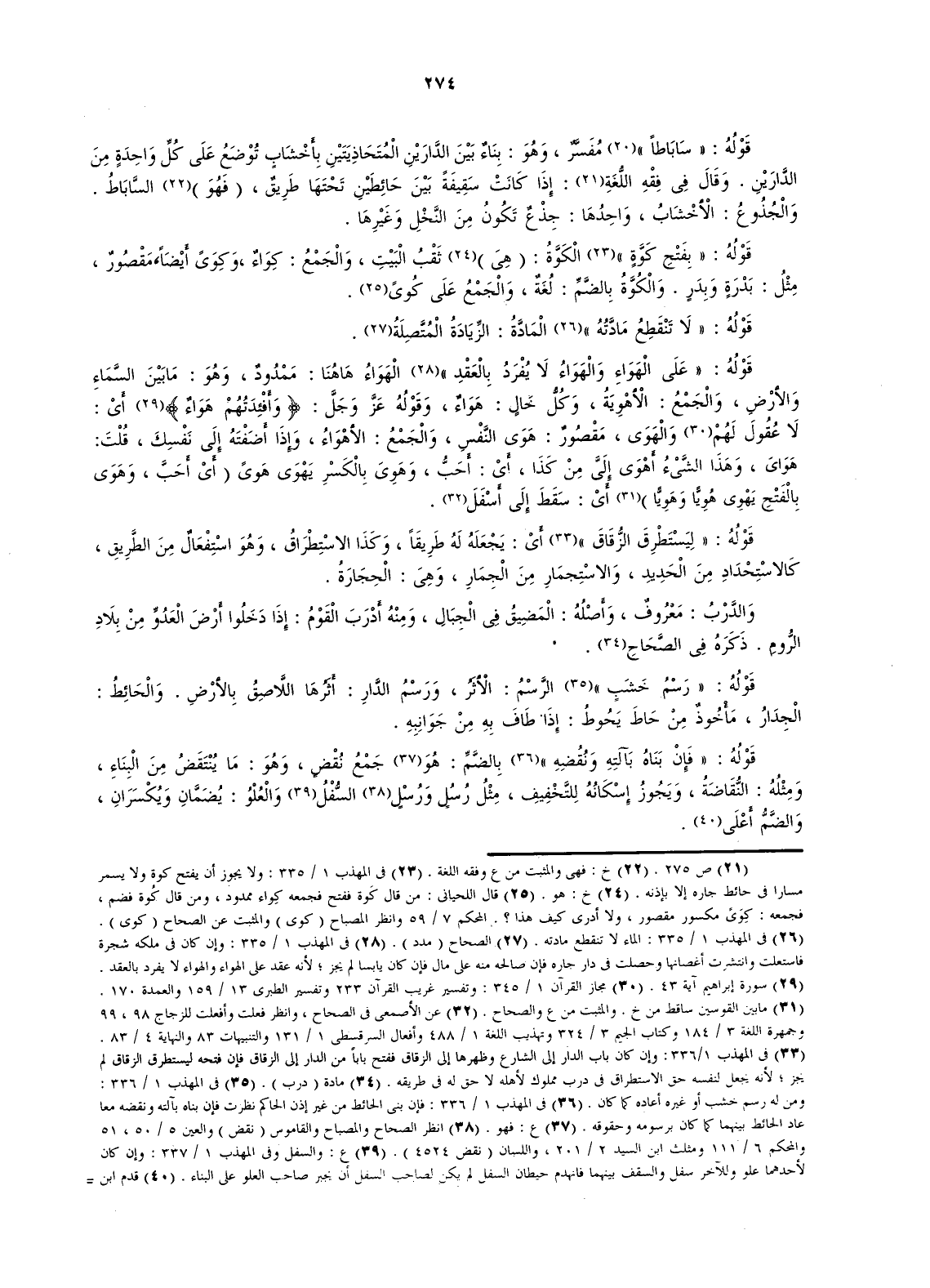 قَوْلُهُ: "عَلَى الْهَوَاءِ وَالْهَوَاءُ لَا يُفْرَدُ بِالْعَقْدِ" (¬28) الْهَوَاءُ هَا هُنَا: مَمْدُودٌ، وَهُوَ: مَا بَيْنَ السَّمَاءِ وَالأرْضِ، وَالْجَمْعُ: الْأهْوِيَةُ، وَكُلُّ خَالٍ: هَوَاء، وَقَوْلُهُ عَزَ وَجَلَّ: {وَأَفْئِدَتُهُمْ هَوَاءٌ} (¬29) أَىْ: لَا عُقولَ لَهُمْ (¬30) وَالْهَوَى، مَقْصُورٌ: هَوَى النَّفْسِ، وَالْجَمْعُ: الأهْوَاءُ، وَإِذَا أضَفْتَهُ إِلَى نَفْسِكَ، قُلْتَ: هَوَاىَ، وَهَذَا الشَّىْءُ أَهْوَى إِلَىَّ مِنْ كَذَا، أَىْ: أَحَبُّ، وَهَوِىَ بِالْكَسْرِ يَهْوَى هَوىً (أَىْ أَحَبَّ، وَهَوَى بِالْفَتْحِ يَهْوِى هُوِيًّا وَهَوِيًّا) (¬31) أَىْ: سَقَطَ إِلَى أسْفَلَ (¬32).