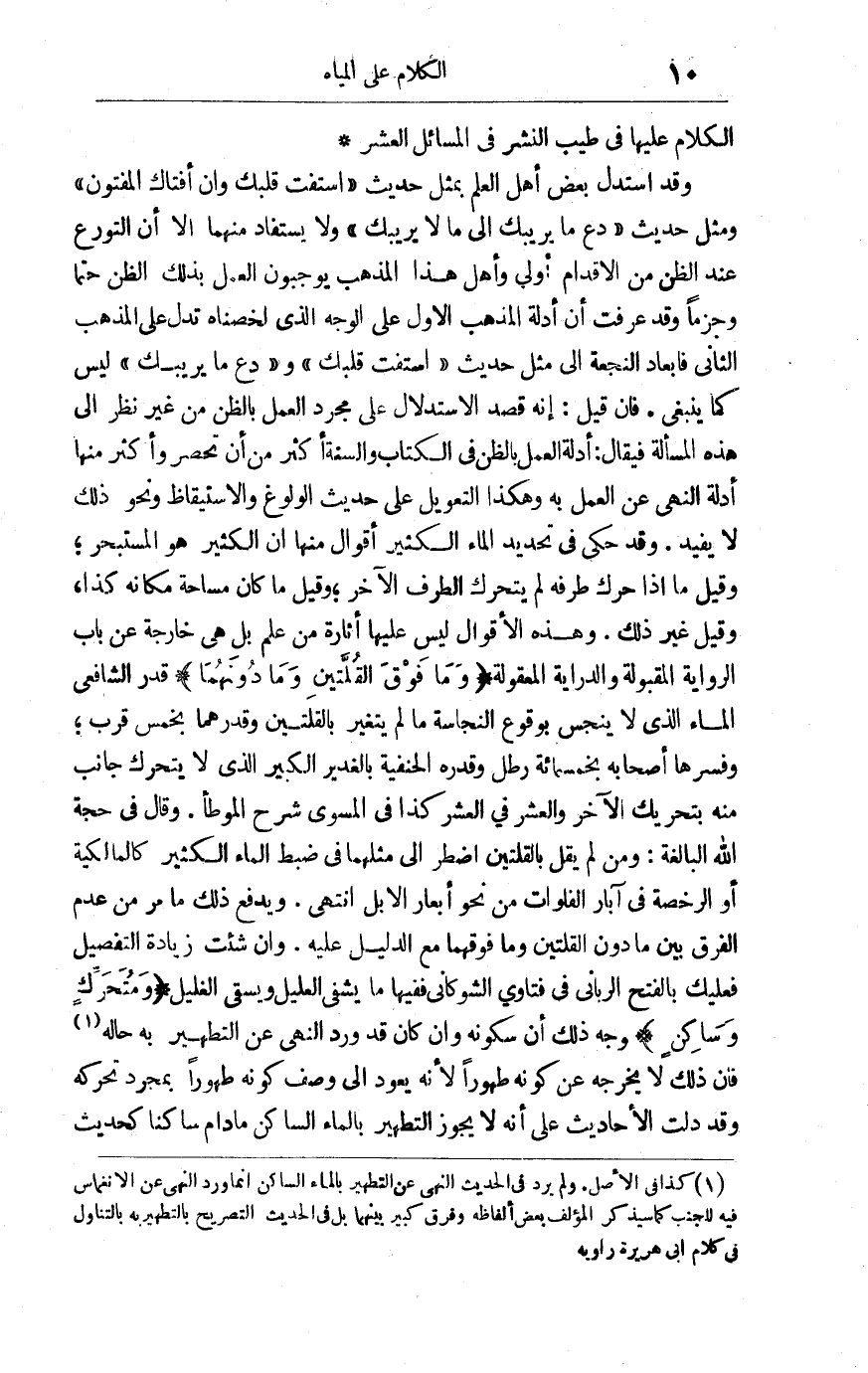 وقد استدل بعض أهل العلم بمثل حديث: "استفت قلبك وإن أفتاك المفتون", ومثل حديث: "دع ما يريبك إلى ما لا يريبك" ولا يستفاد منهما إلا أن التورع عند الظن من الإقدام أولى, وأهل هذا المذهب يوجبون العمل بذلك الظن حتماً وجزماً, وقد عرفت أن أدلة المذهب الأولى على الوجه الذي لخصناه تدل على المذهب الثاني فإبعاد النُّجعة إلى مثل حديث: "استفت قلبك" و"دع ما يريبك" ليس كما ينبغي فإن قيل: إنه قصد الاستدلال على مجرد العمل بالظن من غير نظر إلى هذه المسألة فيقال: أدلة العمل بالظن في الكتاب والسنة أكثر من أن تحصر وأكثر منها أدلة النهي عن العمل به, وهكذا التعويل على حديث الولوغ والاستيقاظ ونحو ذلك لا يفيد, وقد حُكي في تحديد الماء الكثير أقوال منها: أن الكثير هو المستبحر وقيل: ما إذا حُرِّك طرفه لم يتحرك الطرف الآخر, وقيل: ما كان مساحة مكانه كذا وقيل: غير ذلك وهذه الأقوال ليس عليها أثارة من علم بل هي خارجة عن باب الرواية المقبولة والدراية المعقولة.