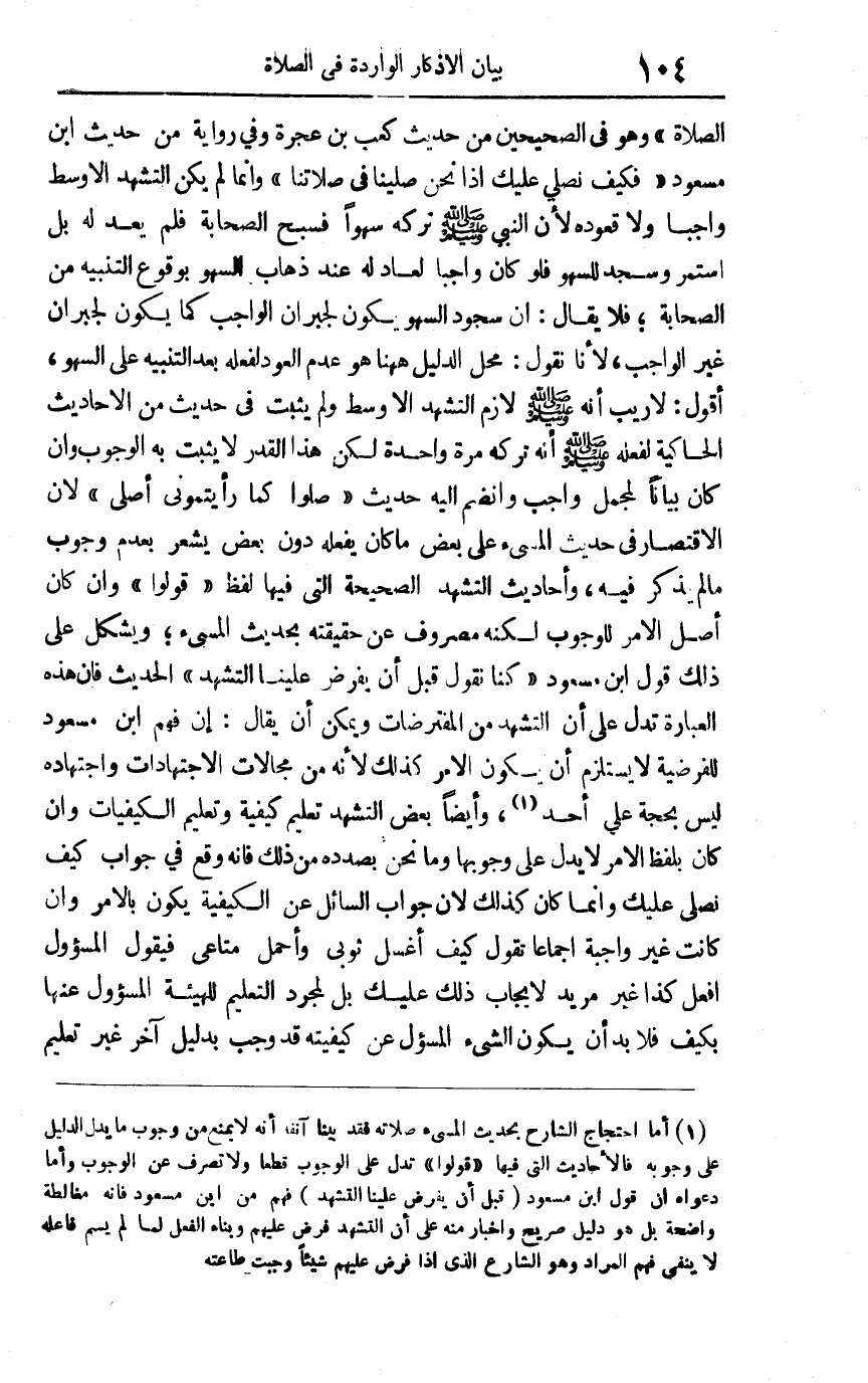 1 أما احتجاج الشارح بحديث المسيء صلاته فقد بينا آنفا أنه لا يمنع من وجوب ما يدل الدليل على وجوبه فالأحاديث التي فيها: "قولوا" تدل على الوجوب قطعا ولا تصرف عن الوجوب وأما دعواه أن قول ابن مسعود: "قبل أن يفرض علينا التشهد" فهم من ابن مسعود فإنه مغالطة صريحة بل هو دليل صريح وإخبار منه على أن التشهد فرض عليهم وبناء الفعل لما لم يسم فاعله لا ينفي فهم المراد وهو الشارع الذي إذا فرض عليهم شيئا وجبت طاعته.