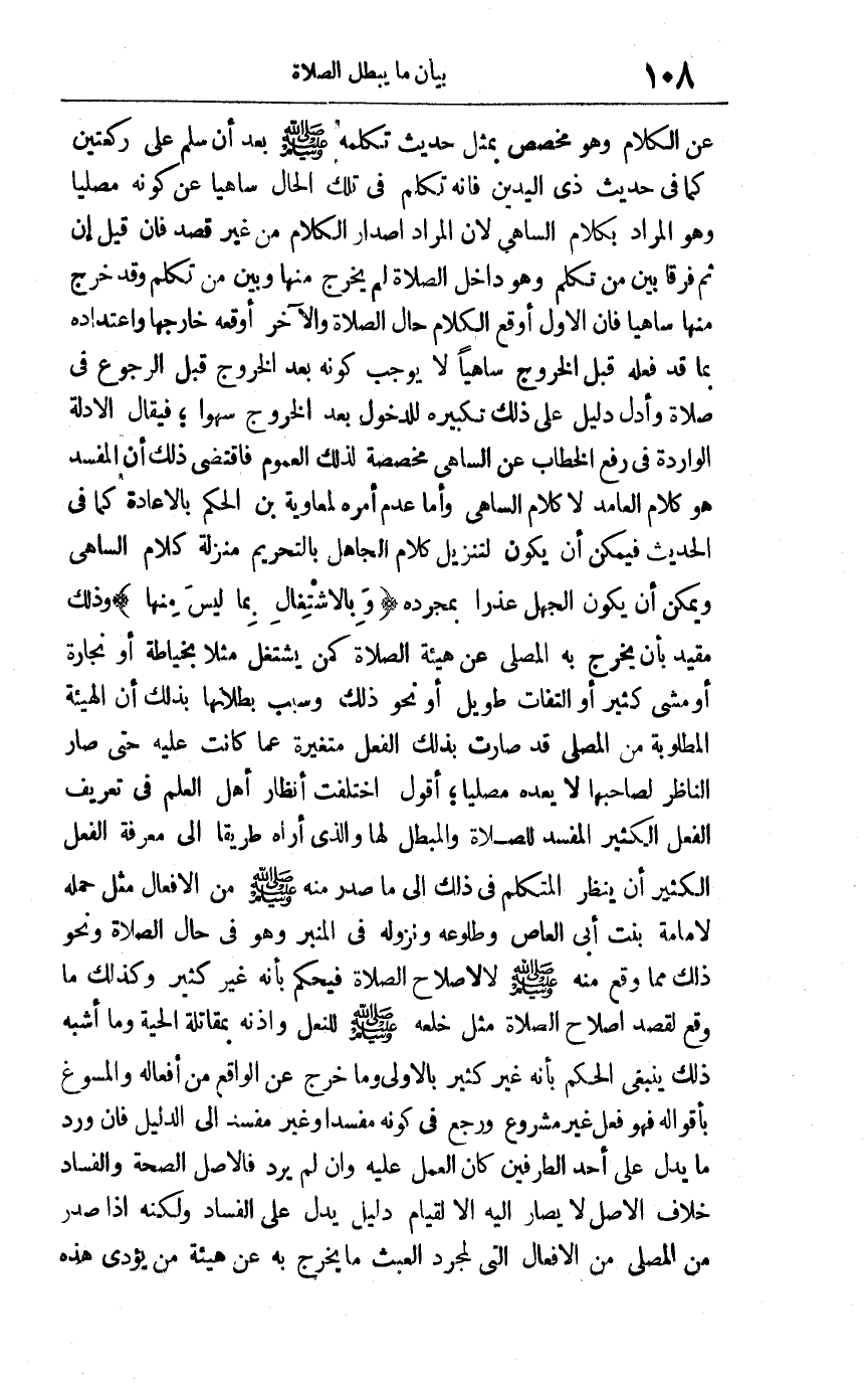 عن الكلام وهو مخصص بمثل حديث تكلمه صلى الله وسلم عليه بعد أن سلم على ركعتين كما في حديث ذي اليدين فإنه تكلم في تلك الحال ساهيا عن كونه مصليا وهو المراد بكلام الساهي لأن المراد إصدار الكلام من غير قصد فإن قيل إن ثم فرقا بين من تكلم وهو داخل الصلاة لم يخرج منها وبين من تكلم وقد خرج منها ساهيا فإن الأول أوقع الكلام حال الصلاة والآخر أوقعه خارجها واعتداده بما قد فعله قبل الخروج ساهيا لا يوجب كونه بعد الخروج قبل الرجوع في صلاة وأدل دليل على ذلك تكبيره للدخول بعد الخروج سهوا فيقال: الأدلة لواردة في رفع الخطاب عن الساهي مخصصة لذلك العموم فاقتضى ذلك أن المفسد هو كلام العامد لا كلام الساهي, وأما عدم أمره لمعاوية بن الحكم بالإعادة كما في الحديث فيمكن أن يكون لتنزيل كلام الجاهل بالتحريم منزلة كلام الساهي ويمكن أن يكون الجهل عذرا بمجرده وبالاشتغال بما ليس منها وذلك مقيد بأن يخرج به المصلي عن هيئة الصلاة كمن يشتغل مثلا بخياطة أو نجارة أو مشي كثير أو التفات طويل أو نحو ذلك وسبب بطلانها بذلك أن الهيئة المطلوبة من المصلي قد صارت بذلك الفعل متغيرة عما كانت عليه حتى صار الناظر لصاحبها لا يعده مصليا, أقول: اختلفت أنظار أهل العلم في تعريف الفعل الكثير المفسد للصلاة والمبطل لها والذي أراه طريقا إلى معرفة الفعل الكثير أن ينظر المتكلم في ذلك إلى ما صدر منه صلى الله وسلم عليه من الأفعال مثل حمله لأمامة بنت أبي العاص وطلوعه ونزوله في المنبر وهو في حال الصلاة ونحو ذلك مما وقع منه صلى الله وسلم عليه لا لإصلاح الصلاة فيحكم بأنه غير كثير, وكذلك ما وقع لقصد إصلاح الصلاة مثل خلعه صلى الله وسلم عليه للنعل وإذنه بمقاتلة الحية وما أشبه ذلك ينبغي الحكم بأنه غير كثير بالأولى وما خرج عن الواقع من أفعاله والمسوغ بأقواله فهو فعل غير مشروع, ورجع في كونه مفسدا وغير مفسد إلى الدليل فإن ورد ما يدل على أحد الطرفين كان العمل عليه وإن لم يرد فالأصل الصحة والفساد خلاف الأصل لا يصار إليه إلا لقيام دليل يدل على الفساد ولكنه إذا صدر من المصلي من الأفعال التي لمجرد العبث ما يخرج به عن هيئة من يؤدي هذه