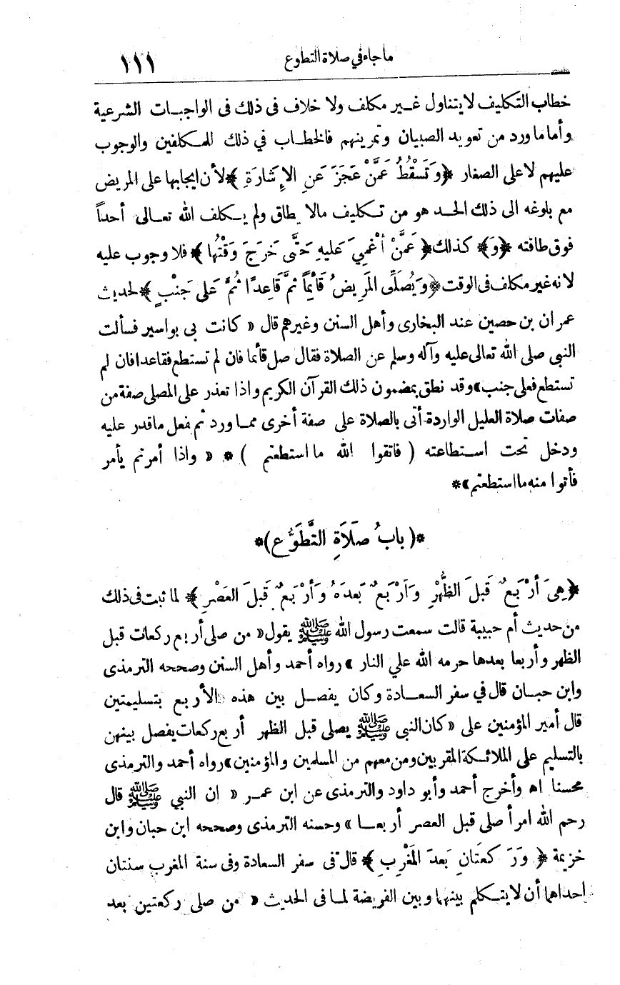 "هي أربع قبل الظهر وأربع بعده وأربع قبل العصر". لما ثبت في ذلك من حديث أم حبيبة قالت: سمعت رسول الله صلى الله وسلم عليه يقول: "من صلى أربع ركعات قبل الظهر وأربعا بعدها حرمه الله على النار" رواه أحمد وأهل السنن وصححه الترمذي وابن حبان قال في سفر السعادة: وكان يفصل بين هذه الأربع بتسليمتين قال أمير المؤمنين علي: كان النبي صلى الله وسلم عليه يصلي قبل الظهر أربع ركعات يفصل بينهن بالتسليم على الملائكة المقربين ومن معهم من المسلمين والمؤمنين. رواه أحمد والترمذي محسنا اهـ. وأخرج أحمد وأبو داود والترمذي عن ابن عمر: أن النبي صلى الله وسلم عليه قال: "رحم الله امرأ صلى قبل العصر أربعا" وحسنه الترمذي وصححه ابن حبان وابن خزيمة. "وركعتان بعد المغرب" قال في سفر السعادة: وفي سنة المغرب سنتان: إحداهما أن لا يتكلم بينهما وبين الفريضة لما في الحديث: "من صلى ركعتين بعد