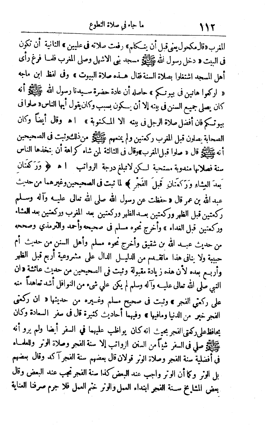 المغرب". قال مكحول: يعني قبل أن يتكلم رُفعت صلاته في عليين. الثانية: أن تكون في البيت, دخل رسول الله صلى الله وسلم عليه مسجد بني الأشهل وصلى المغرب فلما فرغ رأى أهل المسجد اشتغلوا بصلاة السنة فقال: "هذه صلاة البيوت" وفي لفظ ابن ماجه: "اركعوا هاتين في بيوتكم". حاصله: أن عادة حضرة سيدنا رسول الله صلى الله وسلم عليه أنه كان يصلي جميع السنن في بيته إلا أن يكون بسبب وكان يقول: أيها الناس: "صلوا في بيوتكم فإن أفضل صلاة الرجل في بيته إلا المكتوبة" اهـ. وقال أيضا: وكان الصحابة يصلون قبل المغرب ركعتين ولم يمنعهم صلى الله وسلم عليه من ذلك وثبت في الصحيحين أنه صلى الله وسلم عليه قال: "صلوا قبل المغرب" وقال في الثالثة: "لمن شاء" كراهة أن يتخذها الناس سنة فصلاتها مندوبة مستحبة لكن لا تبلغ درجة الرواتب اهـ. "وركعتان بعد العشاء وركعتان قبل الفجر" لما ثبت في الصحيحين وغيرهما من حديث عبد الله بن عمر قال: حفظت عن رسول الله صلى الله تعالى عليه وآله وسلم: ركعتين قبل الظهر وركعتين بعد الظهر وركعتين بعد المغرب وركعتين بعد العشاء وركعتين قبل الغداة". وأخرج نحوه مسلم في صحيحه وأحمد والترمذي وصححه من حديث عبد الله بن شقيق, وأخرج نحوه مسلم وأهل السنن من حديث أم حبيبة ولا ينافي هذا ما تقدم من الدليل الدال على مشروعية أربع قبل الظهر وأربع بعده لأن هذه زيادة مقبولة وثبت في الصحيحين من حديث عائشة أن النبي صلى الله تعالى عليه وآله وسلم لم يكن على شيء من النوافل أشد تعاهداً منه على ركعتي الفجر. وثبت في صحيح مسلم وغيره من حديثها: أن ركعتي الفجر خير من الدنيا وما فيها, وفيهما أحاديث كثيرة. قال في سفر السعادة: وكان يحافظ على ركعتي الفجر بحيث إنه كان يواظب عليهما في السفر أيضا ولم يرو أنه صلى الله وسلم عليه صلى في السفر شيئا من السنن الرواتب إلا سنة الفجر وصلاة الوتر, وللعلماء في أفضلية سنة الفجر وصلاة الوتر قولان: قال بعضهم: سنة الفجر آكد, وقال بعضهم: بل الوتر, وكما أن الوتر واجب عند البعض كذا سنة الفجر تجب عند البعض, وقال بعض المشايخ: سنة الفجر ابتداء العمل والوتر ختم العمل فلا جرم صرفنا العناية