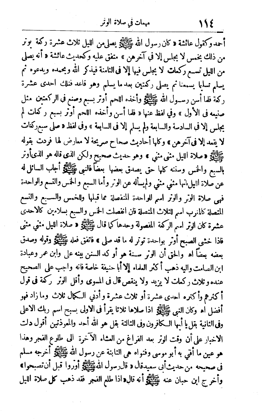أحمد وكقول عائشة: كان رسول الله صلى الله وسلم عليه يصلي من الليل ثلاث عشرة ركعة يوتر من ذلك بخمس لا يجلس إلا في آخرهن متفق عليه. وكحديث عائشة: أنه يصلي من الليل تسع ركعات لا يجلس فيها إلا في الثامنة فيذكر الله ويحمده ويدعوه ثم يسلم تسليماً يسمعنا ثم يصلي ركعتين بعدما يسلم وهو قاعد فتلك إحدى عشرة ركعة فلما أسن رسول الله صلى الله وسلم عليه وأخذه اللحم أوتر بسبع وصنع في الركعتين مثل صنيعه في الأول, وفي لفظ عنها: فلما أسن وأخذه اللحم أوتر بسبع ركعات لم يجلس إلا في السادسة والسابعة ولم يسلم إلا في السابعة. وفي لفظ: صلى سبع ركعات لا يقعد إلا في آخرهن, وكلها أحاديث صحاح صريحة لا معارض لها فرُدّت بقوله صلى الله وسلم عليه: "صلاة الليل مثنى مثنى" وهو حديث صحيح ولكن الذي قاله هو الذي أوتر بالسبع والخمس وسنته كلها حق يصدق بعضها بعضا فالنبي صلى الله وسلم عليه أجاب السائل له عن صلاة الليل بأنها مثنى مثنى ولم يسأله عن الوتر, وأما السبع والخمس والتسع والواحدة فهي صلاة الوتر والوتر اسم للواحدة المنفصلة مما قبلها وللخمس والسبع والتسع المتصلة كالمغرب اسم للثلاث المتصلة فإن انفصلت الخمس والسبع بسلامين كالإحدى عشرة كان الوتر اسم الركعة المفصولة وحدها قال صلى الله وسلم عليه: "صلاة الليل مثنى مثنى فإذا خشي الصبح أوتر بواحدة توتر له ما قد صلى" فاتفق فعله صلى الله وسلم عليه وقوله وصدق بعضه بعضا اهـ. والحق أن الوتر سنة هو أو كد السنن بينه علي وابن عمر وعبادة ابن الصامت وإليه ذهب أكثر العلماء إلا أبا حنيفة خاصة فإنه واجب على الصحيح عنده. وثلاث ركعات لا يزيد ولا ينقص قال في المسوى: وأقل الوتر ركعة في قول أكثرهم وأكثره إحدى عشرة أو ثلاث عشرة وأدنى الكمال ثلاث وما زاد فهو أفضل اهـ. وكان النبي صلى الله وسلم عليه إذا صلاها ثلاثا يقرأ في الأولى بـ {سَبِّحِ اسْمَ رَبِّكَ الْأَعْلَى} وفي الثانية: بـ {قُلْ يَا أَيُّهَا الْكَافِرُونَ} وفي الثالثة: بـ {قُلْ هُوَ اللَّهُ أَحَدٌ} والمعوذتين. أقول: دلت الأخبار على أن وقت الوتر بعد الفراغ من العشاء الآخرة إلى طلوع الفجر وهذا هو عين ما أفتى به أبو موسى وفتواه هي الثابتة عن رسول الله صلى الله وسلم عليه أخرجه مسلم في صحيحه من حديث أبي سعيد قال: قال رسول الله صلى وسلم عليه: "أوتروا قبل أن تصبحوا" وأخرج ابن حبان عنه صلى الله وسلم عليه أنه قال: "إذا طلع الفجر فقد ذهب كل صلاة الليل"