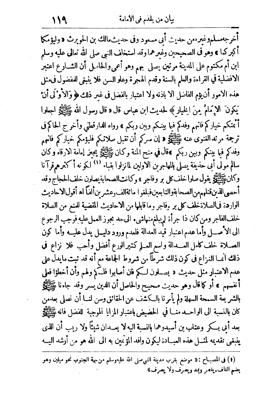 أخرجه مسلم وغيره من حديث أبي مسعود وفي حديث مالك بن الحويرث: "وليؤمكما أكبركما" وهو في الصحيحين وغيرهما, وقد استخلف النبي صلى الله تعالى عليه وسلم ابن أم مكتوم على المدينة مرتين يصلي بهم وهو أعمى. والحاصل: أن الشارع اعتبر الأفضلية في القراءة والعلم بالسنة وقدم الهجرة وعلو السن فلا ينبغي للمفضول في مثل هذه الأمور أن يؤم الفاضل إلا بإذنه ولا اعتبار بالفضل في غير ذلك. والأولى أن يكون الإمام من الخيار لحديث ابن عباس قال: قال رسول الله صلى الله وسلم عليه: "اجعلوا أئمتكم خياركم فإنهم وفدكم فيما بينكم وبين ربكم". رواه الدارقطني, وأخرج الحاكم في ترجمة مرثد الغنوي عنه صلى الله وسلم عليه: "إن سركم أن تقبل صلاتكم فليؤمكم خياركم فإنهم وفدكم فيما بينكم وبين ربكم" قال في منح المنة: وكان صلى الله وسلم عليه يجيز إمامة الأرقاء وكان سالم مولى أبي حذيفة يصلي بالمهاجرين الأولين لما نزلوا بقباء1 لكونه أكثرهم قرآنا وكان صلى الله وسلم عليه يقول: "صلوا خلف كل بر وفاجر" وكانت الصحابة خلف الحجاج وقد أحصي الذين قتلهم من الصحابة والتابعين فبلغوا مائة ألف وعشرين ألفا اهـ. أقول: الأحاديث الواردة في الصلاة خلف كل بر وفاجر وما قابلها من الأحاديث المقضية للمنع من الصلاة خلف الفاجر ومن كان ذا جرأة لم يبلغ منها شيء إلى حد يجوز العمل عليه فوجب الرجوع إلى الأصل, وأما عدم اعتبار قيد العدالة فلعدم ورود دليل يدل عليه, وأما كون الصلاة خلف كامل العدالة واسع العلم كثير الورع أفضل وأحب فلا نزاع في ذلك إنما النزاع في كون ذلك شرطا من شروط الجماعة مع أنه قد ثبت ما يدل على عدم الاعتبار مثل حديث: "يصلون لكم فإن أصابوا فلكم ولهم وإن أخطؤوا فعلى أنفسهم" أو كما قال وهو حديث صحيح. والحاصل: أن الدين يسر وقد جاءنا صلى الله وسلم عليه بالشريعة السمحة السهلة ولم يأمرنا بالكشف عن الحقائق وسن أن نصلي بعد من كان بالنسبة إلى الواحد منا في الحضيض باعتبار المزايا الموجبة للفضل فإنه صلى الله وسلم عليه بعد أبي بكر وعتاب بن أسيد وهما بالنسبة إليه لا يعدان شيئا ولا ريب أن الذي ينبغي تقديمه لمثل هذه العبادة ليكون وافد المؤتمين به إلى الله هو من أرشد إليه