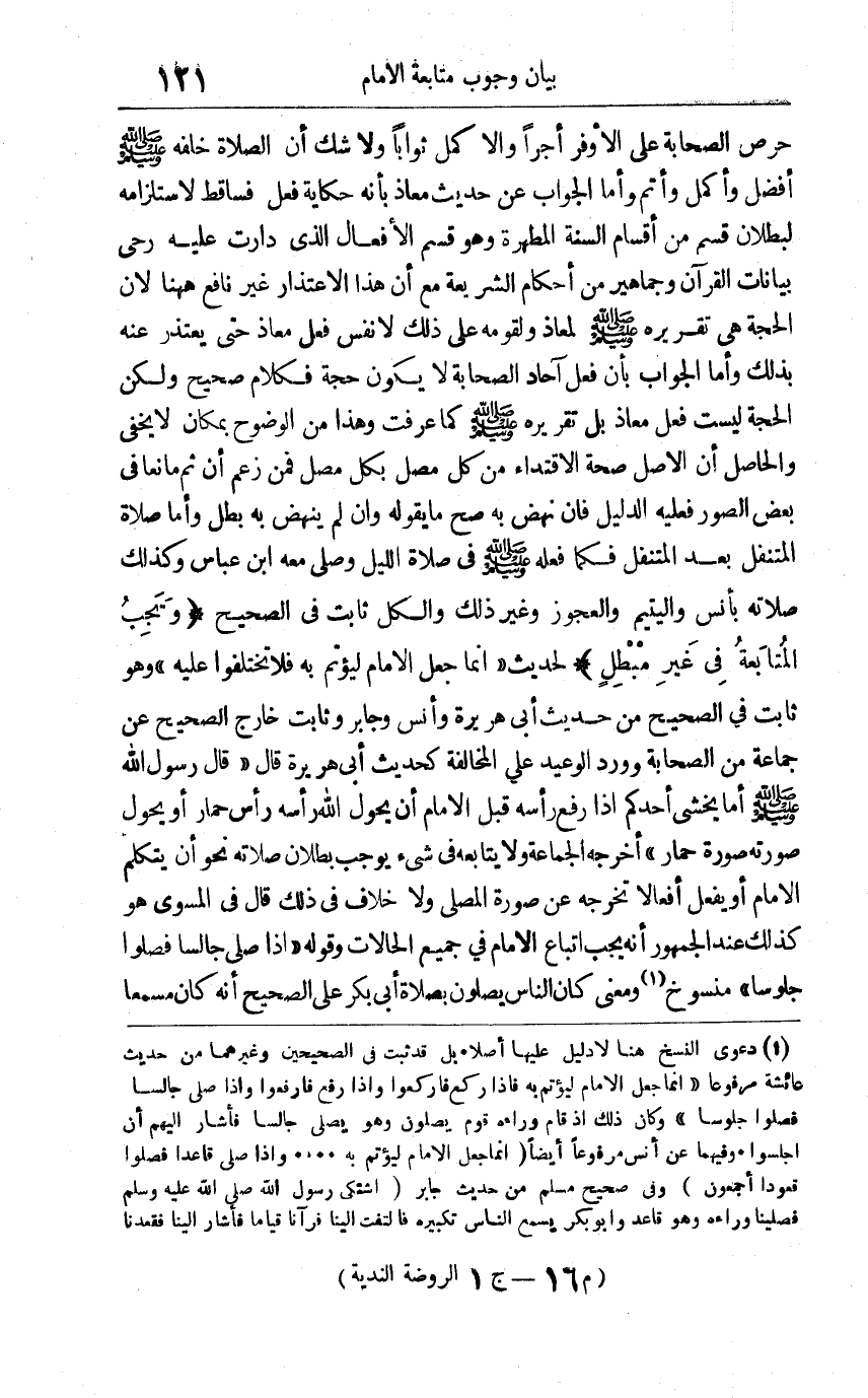 حرص الصحابة على الأوفر أجرا والأكمل ثوابا ولا شك أن الصلاة خلفه صلى الله وسلم عليه أفضل وأكمل وأتم, وأما الجواب عن حديث معاذ بأنه حكاية فعل فساقط لاستلزامه لبطلان قسم من أقسام السنة المطهرة وهو قسم الأفعال الذي دارت عليه رحى بيانات القرآن وجماهير من أحكام الشريعة مع أن هذا الاعتذار غير نافع ههنا لأن الحجة هي تقريره صلى الله وسلم عليه لمعاذ ولقومه على ذلك لا نفس فعل معاذ حتى يعتذر عنه بذلك, وأما الجواب بأن فعل آحاد الصحابة لا يكون حجة فكلام صحيح ولكن الحجة ليست فعل معاذ بل تقريره صلى الله وسلم عليه كما عرفت وهذا من الوضوح بمكان لا يخفى. والحاصل: أن الأصل صحة الاقتداء من كل مصل بكل مصل فمن زعم أن ثمّ مانعاً في بعض الصور فعليه الدليل فإن نهض به صح ما يقوله وإن لم ينهض به بطل وأما صلاة المتنفل بعد المتنفل فكما فعله صلى الله وسلم عليه في صلاة الليل وصلى معه ابن عباس وكذلك صلاته بأنس واليتيم والعجوز وغير ذلك والكل ثابت في الصحيح