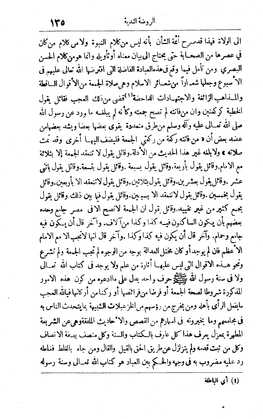 إلى الولاة فهذا قد صرح أئمة الشأن بأنه ليس من كلام النبوة ولا من كلام من كان في عصرها من الصحابة حتى يحتاج إلى بيان معناه أو تأويله, وإنما هو من كلام الحسن البصري ومن تأمل فيما وقع في هذه العبادة الفاضلة التي افترضها الله تعالى عليهم في الأسبوع وجعلها شعارا من شعائر الإسلام وهي صلاة الجمعة من الأقوال الساقطة والمذاهب الزائغة والاجتهادات الداحضة1 قضى من ذلك العجب فقائل يقول: الخطبة كركعتين وإن من فاتته لم تصح جمعته وكأنه لم يبلغه ما ورد عن رسول الله صلى الله تعالى عليه وآله وسلم من طرق متعددة يقوي بعضها بعضا ويشد بعضها من عضد بعض أن: من فاتته ركعة من ركعتي الجمعة فليضف إليها أخرى وقد تمت صلاته. ولا بلغه غير هذا الحديث من الأدلة, وقائل يقول: لا تنعقد الجمعة إلا بثلاثة مع الإمام, وقائل يقول: بأربعة. وقائل يقول: بسبعة, وقائل يقول: بتسعة, وقائل يقول: باثني عشر, وقائل يقول: بعشرين. وقائل يقول: بثلاثين. وقائل يقول: لا تنعقد إلا بأربعين. وقائل يقول: بخمسين. وقائل يقول: لا تنعقد إلا بسبعين. وقائل يقول: فيما بين ذلك. وقائل يقول: بجمع كثير من غير تقييد. وقائل يقول: إن الجمعة لا تصح إلا في مصر جامع وحدّه بعضهم بأن يكون الساكنون فيه كذا وكذا من آلاف, وآخر قال: أن يكون فيه جامع وحمام وآخر قال: أن يكون فيه كذا وكذا, وآخر قال: إنها لا تجب إلا مع الإمام الأعظم فإن لم يوجد أو كان مختل العدالة بوجه من الوجوه لم تجب الجمعة ولم تشرع ونحو هذه الأقوال التي ليس عليها أثارة من علم ولا يوجد في كتاب الله تعالى ولا في سنة رسول الله صلى الله وسلم عليه حرف واحد يدل على ما ادعوه من كون هذه الأمور المذكورة شروطا لصحة الجمعة أو فرضا من فرائضها أو ركنا من أركانها فيالله العجب ما يفعل الرأي بأهله ومن يخرج من رؤوسهم من الخزعبلات الشبيهة بما يتحدث الناس به في مجامعهم وما يخبرونه في أسمارهم من القصص والأحاديث الملفقة وهي عن الشريعة المطهرة بمعزل يعرف هذا كل عارف بالكتاب والسنة وكل متصف بصفة الإنصاف, وكل من ثبت قدمه ولم يتزلزل عن طريق الحق بالقيل والقال, ومن جاء بالغلط فغلطه رد عليه مضروب به في وجهه, والحكم بين العباد هو كتاب الله تعالى وسنة رسوله
