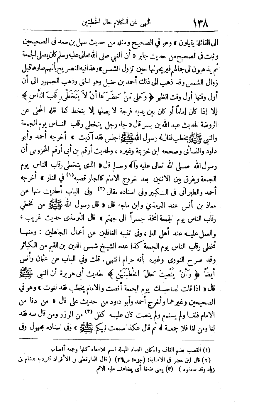 إلى القائلة يقيلون, وهو في الصحيح ومثله من حديث سهل بن سعد في الصحيحين وثبت في الصحيح من حديث جابر أن النبي صلى الله تعالى عليه وسلم كان يصلي الجمعة ثم يذهبون إلى جمالهم فيريحونها حين تزول الشمس, وهذا فيه التصريح بأنهم صلوها قبل زوال الشمس, وقد ذهب إلى ذلك أحمد بن حنبل وهو الحق. وذهب الجمهور إلى أن أول وقتها أول وقت الظهر. "وعلى من حضرها أن لا يتخطى رقاب الناس" إلا إذا كان إماماً أو كان بين يديه فرجة لا يصلها إلا بتخط كما نقله المحلي عن الروضة, لحديث عبد الله ابن بسر قال: جاء رجل يتخطى رقاب الناس يوم الجمعة والنبي صلى الله عليه وسلم يخطب فقال له رسول الله صلى الله عليه وسلم: "اجلس فقد آذيت" أخرجه أحمد وأبو داود والنسائي وصححه ابن خزيمة وغيره, ولحديث أرقم بن أبي أرقم المخزومي أن رسول الله صلى الله تعالى عليه وآله وسلم قال: "الذي يتخطى الناس يوم الجمعة ويفرق بين الاثنين بعد خروج الإمام كالجارّ قُصبه1 في النار". أخرجه أحمد والطبراني في الكبير وفي إسناده مقال2, وفي الباب أحاديث منها عن معاذ بن أنس عند الترمذي وابن ماجه قال: قال رسول الله صلى الله عليه وسلم: "من تخطى رقاب الناس يوم الجمعة اتخذ جسرا إلى جهنم" قا ل الترمذي: حديث غريب والعمل عليه عند أهل العلم. وفي تنبيه الغافلين عن أعمال الجاهلين: ومنها تخطي رقاب الناس يوم الجمعة كذا عده الشيخ شمس الدين بن القيم من الكبائر, وقد صرح النووي وغيره بأنه حرام انتهى. قلت: وفي الباب عن عثمان وأنس أيضا. وأن ينصت حال الخطبتين لحديث أبي هريرة أن النبي صلى الله عليه وسلم قال: "إذا قلت لصاحبك يوم الجمعة أنصت والإمام يخطب فقد لغوت" وهو في الصحيحين وغيرهما وأخرج أحمد وأبو داود من حديث علي قال: "من دنا من الإمام فلغا ولم يستمع ولم ينصت كان عليه كفل3 من الوزر, ومن قال صه فقد لغا ومن لغا فلا جمعة له", ثم قال: هكذا سمعت نبيكم صلى الله عليه وسلم, وفي إسناده مجهول, وفي