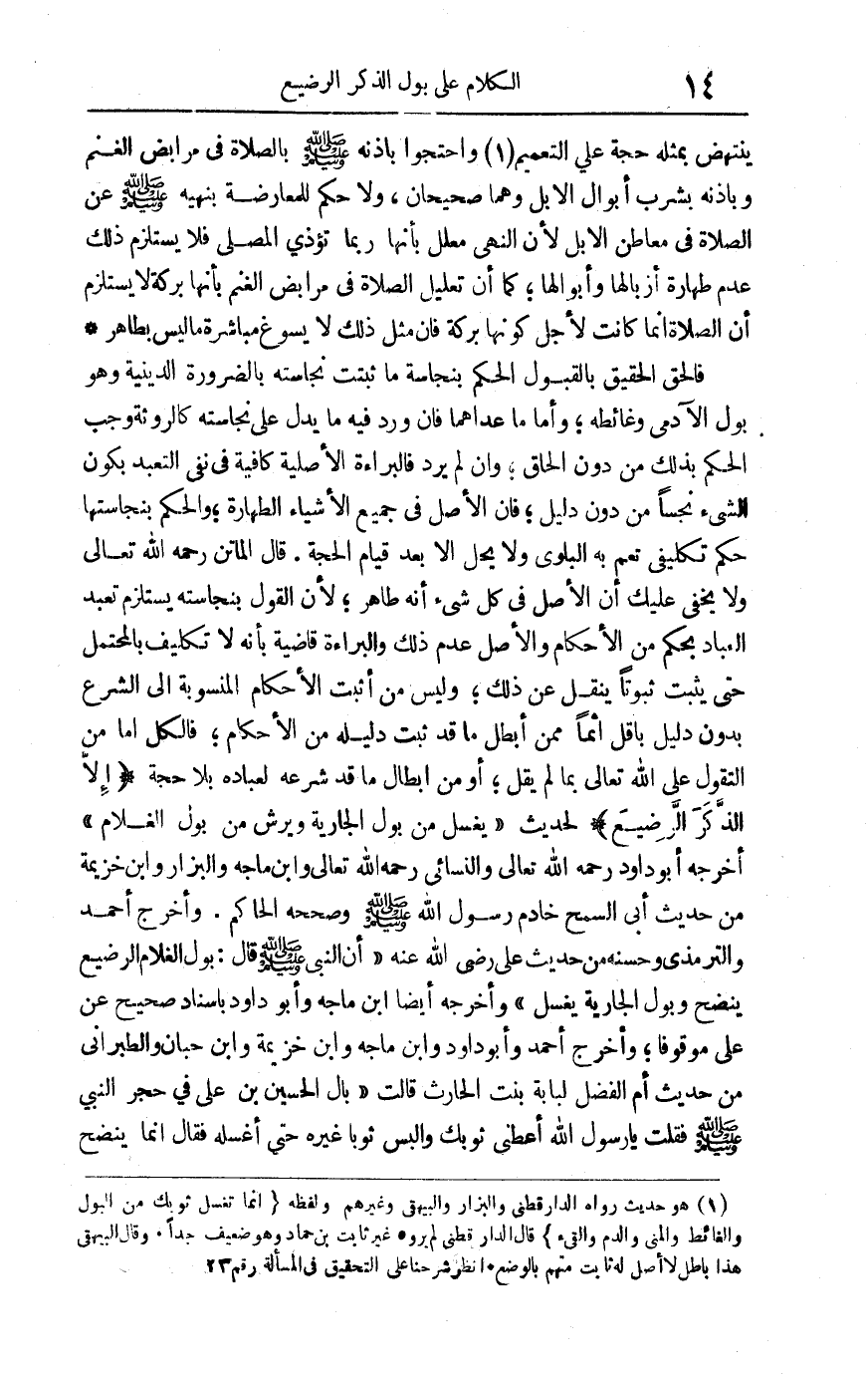 فالحق الحقيق بالقبول الحكم بنجاسة ما ثبتت نجاسته بالضرورة الدينية وهو بول الآدمي وغائطه, وأما ما عداهما فإن ورد فيه ما يدل على نجاسته كالروثة وجب الحكم بذلك من دون إلحاق وإن لم يرد فالبراءة الأصلية كافية في نفي التعبد بكون الشيء نجساً من دون دليل فإن الأصل في جميع الأشياء الطهارة والحكم بنجاستها حكم تكليفي تعم به البلوى, ولا يحل إلا بعد قيام الحجة قال الماتن رحمه الله تعالى: ولا يخفى عليك أن الأصل في كل شيء أنه ظاهر لأن القول بنجاسته يستلزم تعبد العباد بحكم من الأحكام والأصل عدم ذلك والبراءة قاضية بأنه لا تكليف بالمحتمل حتى يثبت ثبوتاً ينقل عن ذلك وليس من أثبت الأحكام المنسوبة إلى الشرع بدون دليل بأقل إثماً ممن أبطل ما قد ثبت دليله من الأحكام فالكل إما من التقول على الله تعالى بما لم يقل أو من إبطال ما قد شرعه لعباده بلا حجة "إلا الذكر الرضيع" لحديث:" يُغسل من بول الجارية ويُرش من بول الغلام" أخرجه أبو داود رحمه الله تعالى والنسائي رحمه الله تعالى وابن ماجه والبزار وابن خزيمة من حديث أبي السمح خادم رسول الله صلى الله عليه وسلم وصححه الحاكم وأخرج أحمد والترمذي وحسنه من حديث علي رضي الله عنه أن النبي صلى الله عليه وسلم قال: "بول الغلام الرضيع يُنضح وبول الجارية يُغسل" وأخرجه أيضا ابن ماجه وأبو داود بإسناد صحيح عن علي موقوفاً, وأخرج أحمد وأبو داود وابن ماجه وابن خريمة وابن حبان والطبراني من حديث أم الفضل لُبابة بنت الحارث قالت: بال الحسين بن علي في حِجر النبي صلى الله عليه وسلم فقلت: يا رسول الله أعطني ثوبك والبس ثوباً غيره حتى أغسله فقال: "إنما يُنضح من بول الذكر ويُغسل