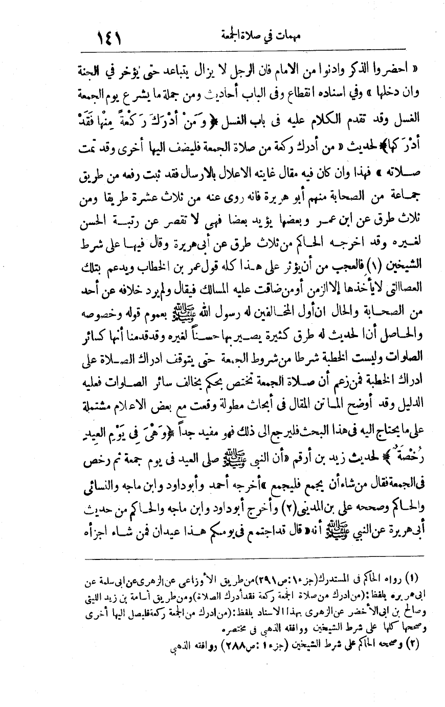 1 رواه الحاكم في المستدرك جزء 1: ص 29 من طريق الأوزاعي عن الزهري عن أبي سلمة عن أبي هريرة بلفظ: "من أدرك من صلاة الجمعة ركعة فقد أدرك الصلاة" ومن طريق أسامة بن زيد الليثي وصالح بن أبي الأخضر عن الزهري بهذا الإسناد بلفظ: "من أدرك من الجمعة ركعة فليصل إليها أخرى وصححها كلها على شرط الشيخين ووافقه الذهبي في مختصره.