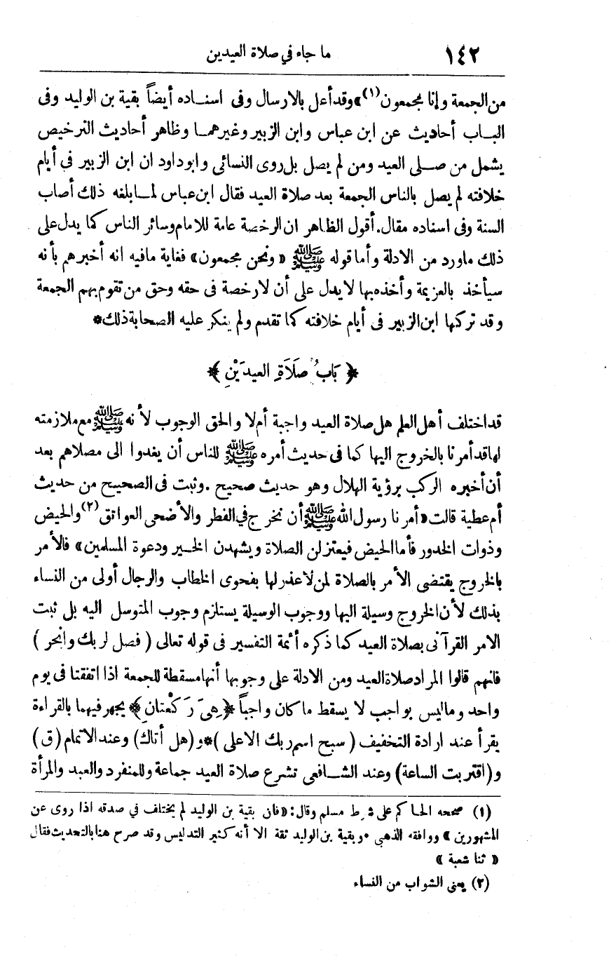 قد اختلف أهل العلم هل صلاة العيد واجبة أم لا؟ والحق الوجوب لأنه صلى الله عليه وسلم مع ملازمته لها قد أمرنا بالخروج إليها كما في حديث أمره صلى الله عليه وسلم للناس أن يغدوا إلى مصلاهم بعد أن أخبره الركب برؤية الهلال وهو حديث صحيح وثبت في الصحيح من حديث أم عطية قالت: أمرنا رسول الله صلى الله عليه وسلم أن نُخرج في الفطر والأضحى العواتق2 والحُيّض وذوات الخدور فأما الحيض فيعتزلن الصلاة ويشهدن الخير ودعوة المسلمين, فالأمر بالخروج يقتضي الأمر بالصلاة لمن لا عذر لها بفحوى الخطاب, والرجال أولى من النساء بذلك لأن الخروج وسيلة إليها ووجوب الوسيلة يستلزم وجوب المتوسل إليه بل ثبت الأمر القرآني بصلاة العيد كما ذكره أئمة التفسير في قوله تعالى: {فَصَلِّ لِرَبِّكَ وَانْحَرْ} فإنهم قالوا: المراد صلاة العيد, ومن الأدلة على وجوبها أنها مسقطة للجمعة إذا اتفقتا في يوم واحد وما ليس بواجب لا يسقط ما كان واجباً. "هي ركعتان" يجهر فيهما بالقراءة يقرأ عند إرادة التخفيف: {سَبِّحِ اسْمَ رَبِّكَ الْأَعْلَى} و {هَلْ أَتَاكَ} وعند الإتمام {ق} و {اقْتَرَبَتِ السَّاعَةُ} وعند الشافعي تشرع صلاة العيد جماعة وللمنفرد والعبد والمرأة