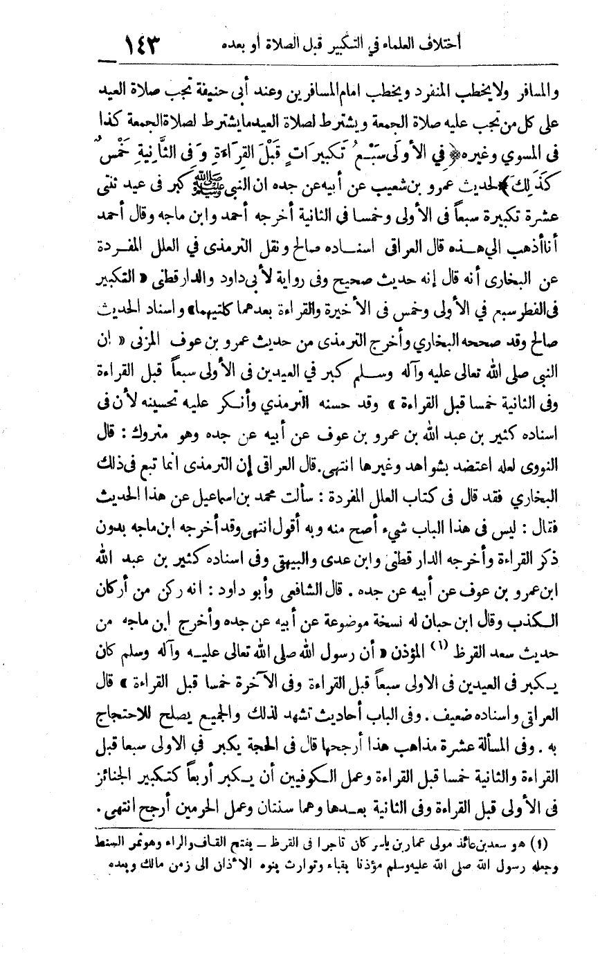 والمسافر ولا يخطب المنفرد ويخطب إمام المسافرين وعند أبي حنيفة تجب صلاة العيد على كل من تجب عليه صلاة الجمعة ويشترط لصلاة العيد ما يشترط لصلاة الجمعة كذا في المسوى وغيره, "في الأولى سبع تكبيرات قبل القراءة وفي الثانية خمس كذلك" لحديث عمرو بن شعيب عن أبيه عن جده أن النبي صلى الله عليه وسلم كبّر في عيد ثنتي عشرة تكبيرة سبعا في الأولى وخمسا في الثانية أخرجه أحمد وابن ماجه, وقال أحمد أنا أذهب إلى هذه قال العراقي إسناده صالح ونقل الترمذي في العلل المفردة عن البخاري أنه قال: إنه حديث صحيح وفي رواية لأبي داود والدارقطني التكبير في الفطر سبع في الأولى وخمس في الأخيرة والقراءة بعدهما كلتيهما, وإسناد الحديث صالح وقد صححه البخاري, وأخرج الترمذي من حديث عمرو بن عوف المزني أن النبي صلى الله تعالى عليه وآله وسلم كبّر في العيدين في الأولى سبعا قبل القراءة وفي الثانية خمسا قبل القراءة وقد حسنه الترمذي وأُنكر عليه تحسينه لأن في إسناده كثير بن عبد الله بن عمرو بن عوف عن أبيه عن جده وهو متروك. قال النووي: لعله اعتضد بشواهد وغيرها انتهى. قال العراقي: إن الترمذي إنما تبع في ذلك البخاري فقد قال في كتاب العلل المفردة: سألت محمد بن إسماعيل عن هذا الحديث فقال: ليس في هذا الباب شيء أصح منه وبه أقول انتهى. وقد أخرجه ابن ماجه بدون ذكر القراءة وأخرجه الدارقطني وابن عدي والبيهقي وفي إسناده كثير بن عبد الله ابن عمرو بن عوف عن أبيه عن جده قال الشافعي وأبو داود: إنه ركن من أركان الكذب, وقال ابن حبان: له نسخة موضوعة عن أبيه عن جده, وأخرج ابن ماجه من حديث سعد القرظ1 المؤذن: أن رسول الله صلى الله تعالى عليه وآله وسلم كان يكبّر في العيدين في الأولى سبعا قبل القراءة وفي الآخرة خسما قبل القراءة. قال العراقي: وإسناده ضعيف, وفي الباب أحاديث تشهد لذلك والجميع يصلح للاحتجاج به وفي المسألة عشرة مذاهب هذا أرجحها. قال في الحجة: يكبر في الأولى سبعا قبل القراءة والثانية خمسا قبل القراءة وعمل الكوفيين أن يكبر أربعا كتكبير الجنائز في الأولى قبل القراءة وفي الثانية بعدها وهما سنتان وعمل الحرمين أرجح انتهى.