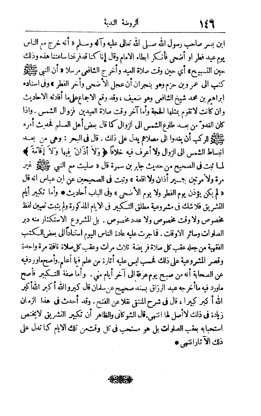 ابن بسر صاحب رسول الله صلى الله تعالى عليه وآله وسلم أنه خرج مع الناس يوم عيد فطر أو أضحى فأنكر إبطاء الإمام وقال: إنا كنا قد فرغنا ساعتنا هذه وذلك حين التسبيح, أي حين وقت صلاة العيد. وأخرج الشافعي مرسلا أن النبي صلى الله عليه وسلم كتب إلى عمرو بن حزم وهو بنجران أن عجل الأضحى وأخر الفطر. وفي إسناده إبراهيم بن محمد شيخ الشافعي وهو ضعيف, وقد وقع الإجماع على ما أفادته الأحاديث وإن كانت لا تقوم بمثلها الحجة, وأما آخر وقت صلاة العيدين فزوال الشمس وإذا كان الغدو من بعد طلوع الشمس إلى الزوال كما قال بعض أهل العلم فحديث أمره صلى الله عليه وسلم للركب أن يغدوا إلى مصلاهم يدل على ذلك قال في البحر: وهي من بعد انبساط الشمس إلى الزوال ولا أعرف فيه خلافا. "ولا أذان فيها ولا إقامة" لما ثبت في الصحيح من حديث جابر بن سمرة قال: صليت مع النبي صلى الله عليه وسلم غير مرة ولا مرتين بغير أذان ولا إقامة, وثبت في الصحيحين عن ابن عباس أنه قال: لم يكن يؤذن يوم الفطر ولا يوم الأضحى. وفي الباب أحاديث. وأما تكبير أيام التشريق فلا شك في مشروعية مطلق التكبير في الأيام المذكورة ولم يثبت تعيين لفظ مخصوص ولا وقت مخصوص ولا عدد مخصوص بل المشروع الاستكثار منه دبر الصلوات وسائر الأوقات فما جرت عليه عادة الناس اليوم استنادا إلى بعض الكتب الفقهية من جملة عقب كل صلاة فريضة ثلاث مرات وعقب كل صلاة نافلة مرة واحدة وقصر المشروعية على ذلك فحسب ليس عليه أثارة من علم فيما أعلم وأصح ما ورد فيه عن الصحابة أنه من صبح يوم عرفة إلى آخر أيام منى, وأما صفة التكبير فأصح ما ورد فيه ما أخرجه عبد الرزاق بسند صحيح عن سلمان قال كبروا: الله أكبر الله أكبر الله أكبر كبيرا قال في شرح المنتقى نقلا عن الفتح: وقد أحدث في هذا الزمان زيادة في ذلك لا أصل لها انتهى. قال الشوكاني: والظاهر أن تكبير التشريق لا يختص استحبابه بعقب الصلوات بل هو مستحب في كل وقت من تلك الأيام كما تدل على ذلك الآثار انتهى.