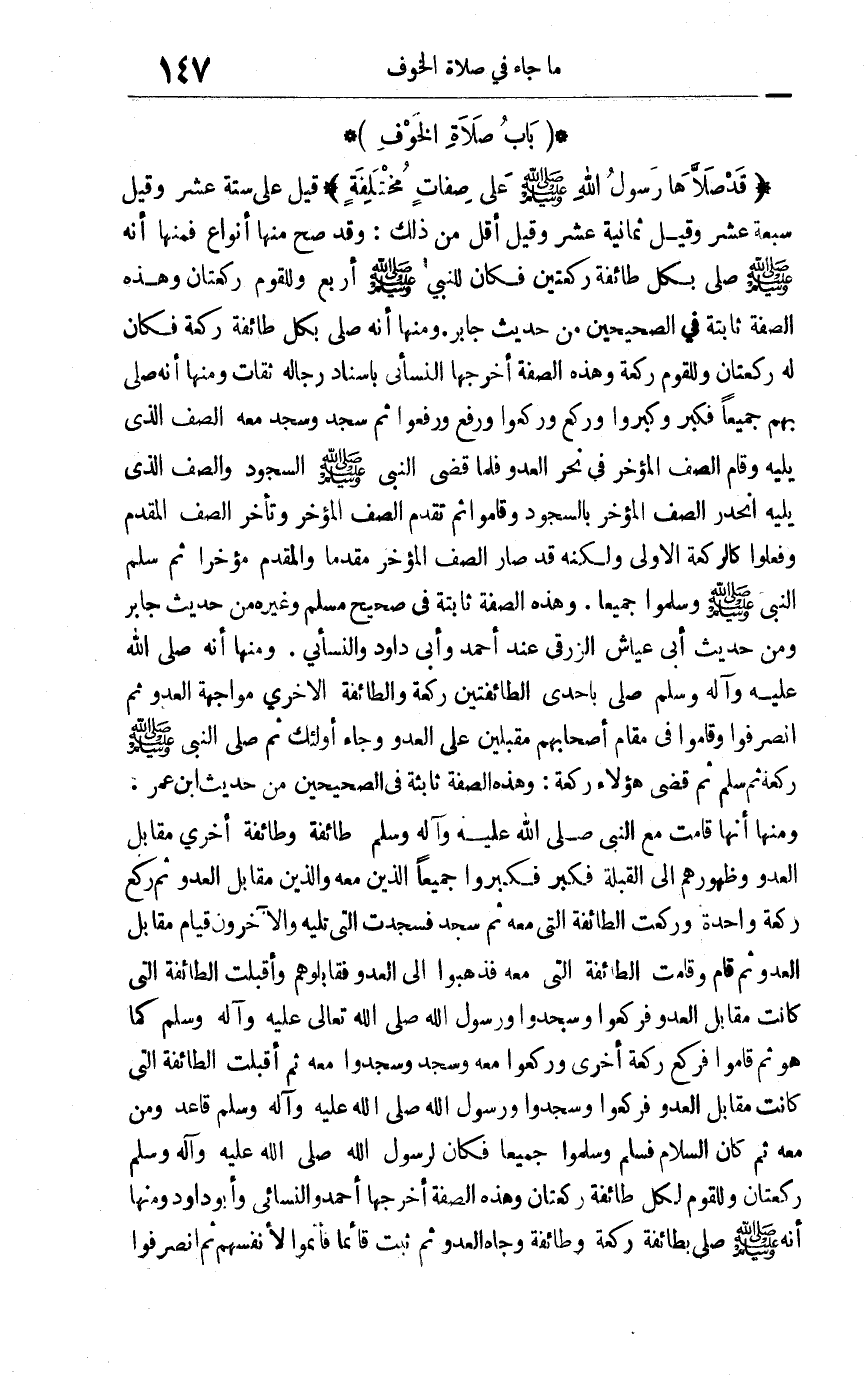 "قد صلاّها رسول الله صلى الله عليه وسلم على صفات مختلفة" قيل على ستة عشر وقيل سبعة عشرة وقيل ثمانية عشر وقيل أقل من ذلك, وقد صح منها أنواع فمنها أنه صلى الله عليه وسلم بكل طائفة ركعتين فكان للنبي صلى الله عليه وسلم أربع وللقوم ركعتان وهذه الصفة ثابتة في الصحيحين من حديث جابر ومنها أنه صلى بكل طائفة ركعة فكان له ركعتان وللقوم ركعة وهذه الصفة أخرجها النسائي بإسناد رجاله ثقات ومنها أنه صلى بهم جميعا فكبر وكبروا وركع وركعوا ورفع ورفعوا ثم سجد وسجد معه الصف الذي يليه وقام الصف المؤخر في نحر العدو فلما قضى النبي صلى الله عليه وسلم السجود والصف الذي يليه انحدر الصف المؤخر بالسجود وقاموا ثم تقدم الصف المؤخر وتأخر الصف المقدم وفعلوا كالركعة الأولى ولكنه قد صار الصف المؤخر مقدما والمقدم مؤخرا ثم سلم النبي صلى الله عليه وسلم وسلموا جميعا وهذه الصفة ثابتة في صحيح مسلم وغيره من حديث جابر ومن حديث أبي عياش الزرقي عند أحمد وأبي داود والنسائي ومنها أنه صلى الله عليه وآله وسلم صلى بإحدى الطائفتين ركعة والطائفة الأخرى مواجهة العدو ثم انصرفوا وقاموا في مقام أصحابهم مقيلين على العدو وجاء أولئك ثم صلى النبي صلى الله عليه وسلم ثم قضى هؤلاء ركعة وهذه الصفة ثابتة في الصحيحين من حديث ابن عمر ومنها أنها قامت مع النبي صلى الله عليه وآله وسلم طائفة وطائفة أخرى مقابل العدو وظهورهم إلى القبلة فكبر فكبروا جميعا الذين معه والذين مقابل العدو ثم ركع ركعة واحدة وركعت الطائفة التي معه ثم سجد فسجدت التي تليه والآخرون قيام مقابل العدو ثم قام وقامت الطائفة التي معه فذهبوا إلى العدو فقابلوهم وأقبلت الطائفة التي كانت مقابل العدو فركعوا وسجدوا ورسول الله صلى الله تعالى عليه وآله وسلم كما هو ثم قاموا فركع ركعة أخرى وركعوا معه وسجد وسجدوا معه ثم أقبلت الطائفة التي كانت مقابل العدو فركعوا وسجدوا ورسول الله صلى الله عليه وآله وسلم قاعد ومن معه ثم كان السلام فسلم وسلموا جميعا فكان لرسول الله صلى الله عليه وآله وسلم ركعتان وللقوم لكل طائفة ركعتان وهذه الصفة أخرجها وأحمد والنسائي وأبو داود ومنها أنه صلى الله عليه وسلم صلى بطائفة ركعة وطائفة وجاه العدو ثم ثبت قائما فأتموا لأنفسهم ثم انصرفوا