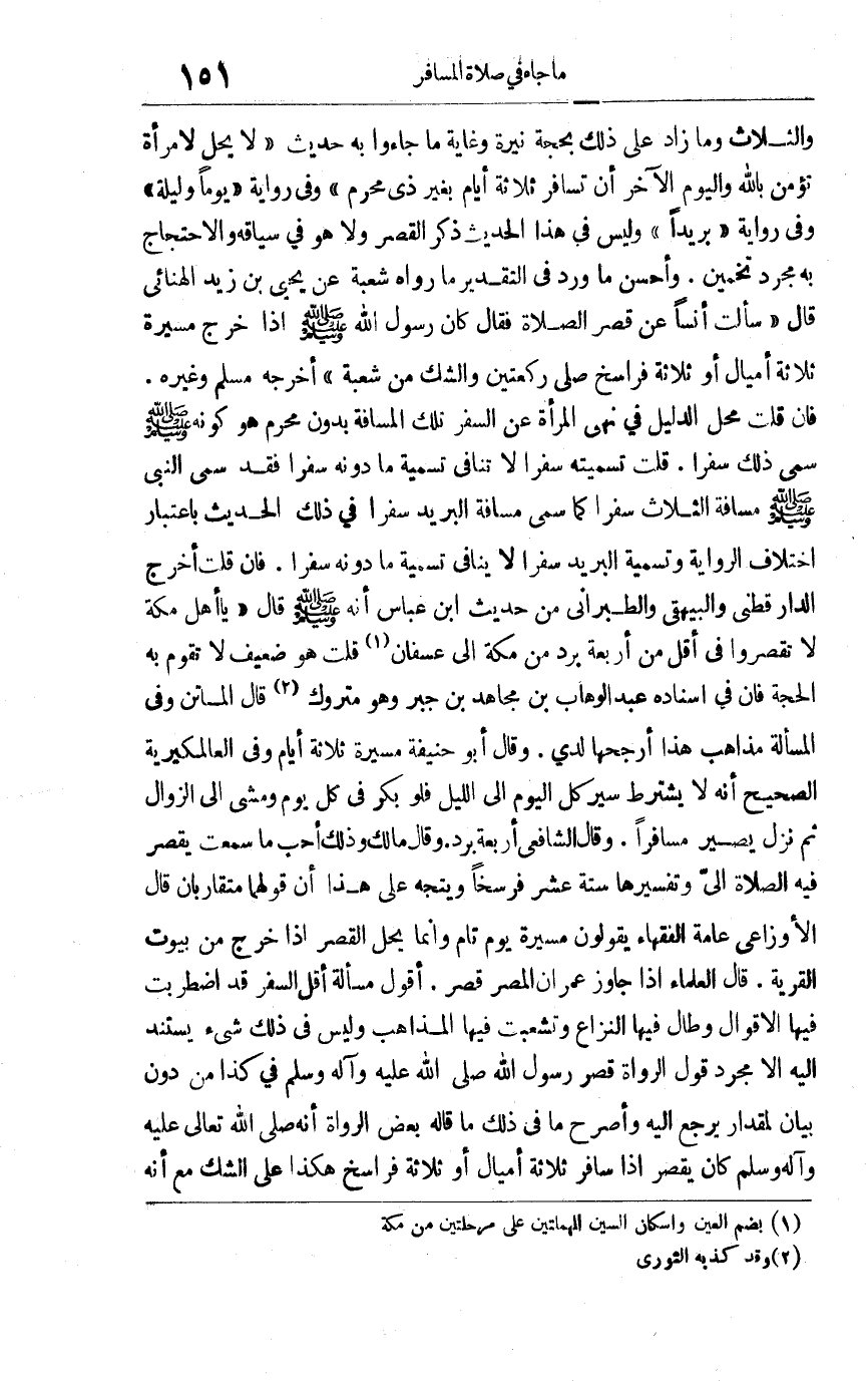 والثلاث وما زاد على ذلك بحجة نيرة وغاية ما جاءوا به حديث: "لا يحل لامرأة تؤمن بالله واليوم الآخر أن تسافر ثلاثة أيام بغير ذي محرم" وفي رواية: "يوما وليلة" وفي رواية: "بريدا" وليس في هذا الحديث ذكر القصر ولا هو في سياقه والاحتجاج به مجرد تخمين وأحسن ما ورد في التقدير ما رواه شعبة عن يحيى بن زيد الهنائي, قال: سألت أنسا عن قصر الصلاة فقال: كان رسول الله صلى الله عليه وسلم إذا خرج مسيرة ثلاثة أميال أو ثلاثة فراسخ صلى ركعتين والشك في شعبة. أخرجه مسلم وغيره فإن قلت: محل الدليل في نهي المرأة عن السفر تلك المسافة بدون محرم هو كونه صلى الله عليه وسلم سمى ذلك سفرا. قلت: تسميته سفرا لا تنافي تسمية ما دونه سفرا فقد سمى النبي صلى الله عليه وسلم مسافة الثلاث سفرا كما سمى مسافة البريد سفرا في ذلك الحديث باعتبار اختلاف الرواية وتسمية البريد سفرا لا ينافي تسمية ما دونه سفرا, فإن قلت أخرج الدارقطني والبيهقي والطبراني من حديث ابن عباس أنه صلى الله عليه وسلم قال: "يا أهل مكة لا تقصروا في أقل من أربعة برد من مكة إلى عسفان1". قلت: هو ضعيف لا تقوم به الحجة فإن في إسناده عبد الوهاب بن مجاهد بن جبر وهو متروك2. قال الماتن وفي المسألة مذاهب هذا أرجحها لدي, وقال أبو حنيفة: مسيرة ثلاثة أيام وفي العالمكيرية الصحيح أنه لا يشترط سير كل اليوم إلى الليل فلو بكر في كل يوم ومشى إلى الزوال ثم نزل يصير مسافرا, وقال الشافعي أربعة برد وقال مالك وذلك أحب ما سمعت يقصر فيه الصلاة إلي وتفسيرها ستة عشر فرسخا ويتجه على هذا أن قولهما متقاربان قال الأوزاعي: عامة الفقهاء يقولون مسيرة يوم تام وإنما يحل القصر إذا خرج من بيوت القرية. قال العلماء: إذا جاوز عمران المصر قصر. أقول مسألة أقل السفر قد اضطربت فيها الأقوال وطال فيها النزاع وتشعبت فيها المذاهب وليس في ذلك شيء يستند إليه إلا مجرد قول الرواة قصر رسول الله صلى الله عليه وآله وسلم في كذا من دون بيان لمقدار يرجع إليه, وأصرح ما في ذلك ما قاله بعض الرواة أنه صلى الله تعالى عليه وآله وسلم كان يقصر إذا سافر ثلاثة أميال أو ثلاثة فراسخ هكذا على الشك مع أنه