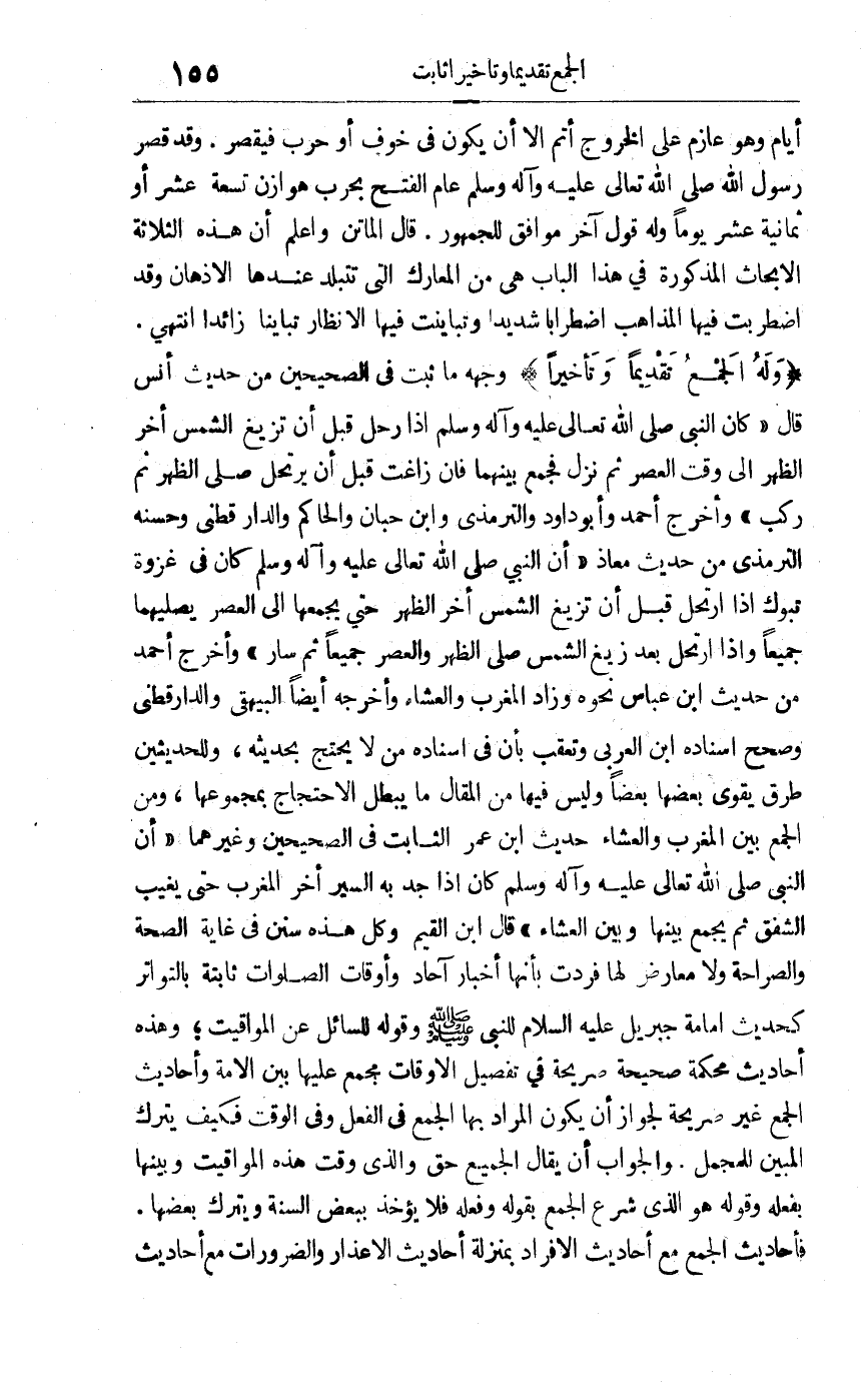 "وله الجمع تقديما وتأخيرا" وجهه ما ثبت في الصحيحين من حديث أنس قال: كان النبي صلى الله عليه وآله وسلم إذا رحل قبل أن تزيغ الشمس أخّر الظهر إلى وقت العصر ثم نزل فجمع بينهما فإن زاغت قبل أن يرتحل صلى الظهر ثم ركب". وأخرج أحمد وأبو دواد والترمذي وابن حبان والحاكم والدارقطني وحسنه الترمذي من حديث معاذ أن النبي صلى الله تعالى عليه وآله وسلم كان في غزوة تبوك إذا ارتحل قبل أن تزيغ الشمس أخر الظهر حتى يجمعها إلى العصر يصليهما جميعا وإذا ارتحل بعد زيغ الشمس صلى الظهر والعصر جميعا ثم سار". وأخرج أحمد من حديث ابن عباس نحوه وزاد المغرب والعشاء وأخرجه أيضا البيهقي والدارقطني وصحح إسناده ابن العربي وتُعقِّب بأن في إسناده من لا يحتج بحديثه, وللحديثين طرق يقوي بعضها بعضا وليس فيها من المقال ما يبطل الاحتجاج بمجموعها, ومن الجمع بين المغرب والعشاء حديث ابن عمر الثابت في الصحيحين وغيرهما أن النبي صلى الله تعالى عليه وآله وسلم كان إذا جد به السير أخر المغرب حتى يغيب الشفق ثم يجمع بينها وبين العشاء. قال ابن القيم: وكل هذه سنن في غاية الصحة والصراحة ولا معارض لها فرُدّت بأنها أخبار آحاد وأوقات الصلوات ثابتة بالتواتر لحديث إمامة جبريل عليه السلام للنبي صلى الله عليه وسلم, وقوله للسائل عن المواقيت وهذه أحاديث محكمة صحيحة صريحة في تفصيل الأوقات مجمع عليها بين الأمة وأحاديث الجمع غير صريحة لجواز أن يكون المراد بها الجمع في الفعل وفي الوقت فكيف يترك المبين للمجمل. والجواب أن يقال: الجميع حق والذي وقت هذه المواقيت وبينها بفعله وقوله هو الذي شرع الجمع بقوله وفعله فلا يؤخذ ببعض السنة ويترك بعضها. فأحاديث الجمع مع أحاديث الأفراد بمنزلة أحاديث الأعذار والضرورات مع أحاديث