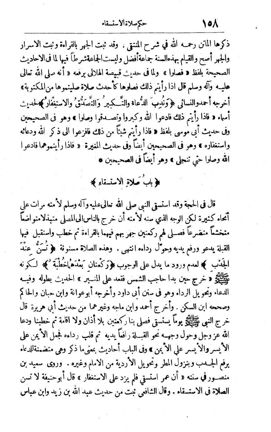 قال في الحجة: وقد استسقى النبي صلى الله تعالى عليه وآله وسلم لأمته مرات على أنحاء كثيرة لكن الوجه الذي سنه لأمته أن خرج بالناس إلى المصلى متبذلا متواضعا متخشعا متضرعا فصلى لهم ركعتين جهر بهم فيهما بالقراءة ثم خطب واستقبل فيها القبلة يدعو ورفع يديه وحول رداءه انتهى. وهذه الصلاة مسنونة تسن عند الجدب لعدم ورود ما يدل على الوجوب ركعتان بعدهما خطبة لكونه صلى الله عليه وسلم خرج حين بدا حاجب الشمس فقعد على المنبر. الحديث بطوله وفيه الدعاء وتحويل الرداء وهو في سنن أبي داود وأخرجه أبو عوانة وابن حبان والحاكم وصححه ابن السكن وأخرج أحمد وابن ماجه وغيرهما من حديث أبي هريرة قال: خرج النبي صلى الله عليه وسلم يوما يستسقي فصلى بنا ركعتين بلا أذان ولا إقامة ثم خطبنا ودعا الله عز وجل وحول وجهه نحو القبلة رافعا يديه ثم قلب رداءه فجعل الأيمن على الأيسر والأيسر على الأيمن. وفي الباب أحاديث بمعنى ما ذكر وهي متضمنة للدعاء برفع الجدب وبنزول المطر وتحويل الأردية من الإمام وغيره, وروى سعيد بن منصور في سننه أن عمر استسقى فلم يزد على الاستغفار. قال أبو حنيفة: لا تسن الصلاة في الاستسقاء, وقال الشافعي: ثبت من حديث عبد الله بن زيد وابن عباس
