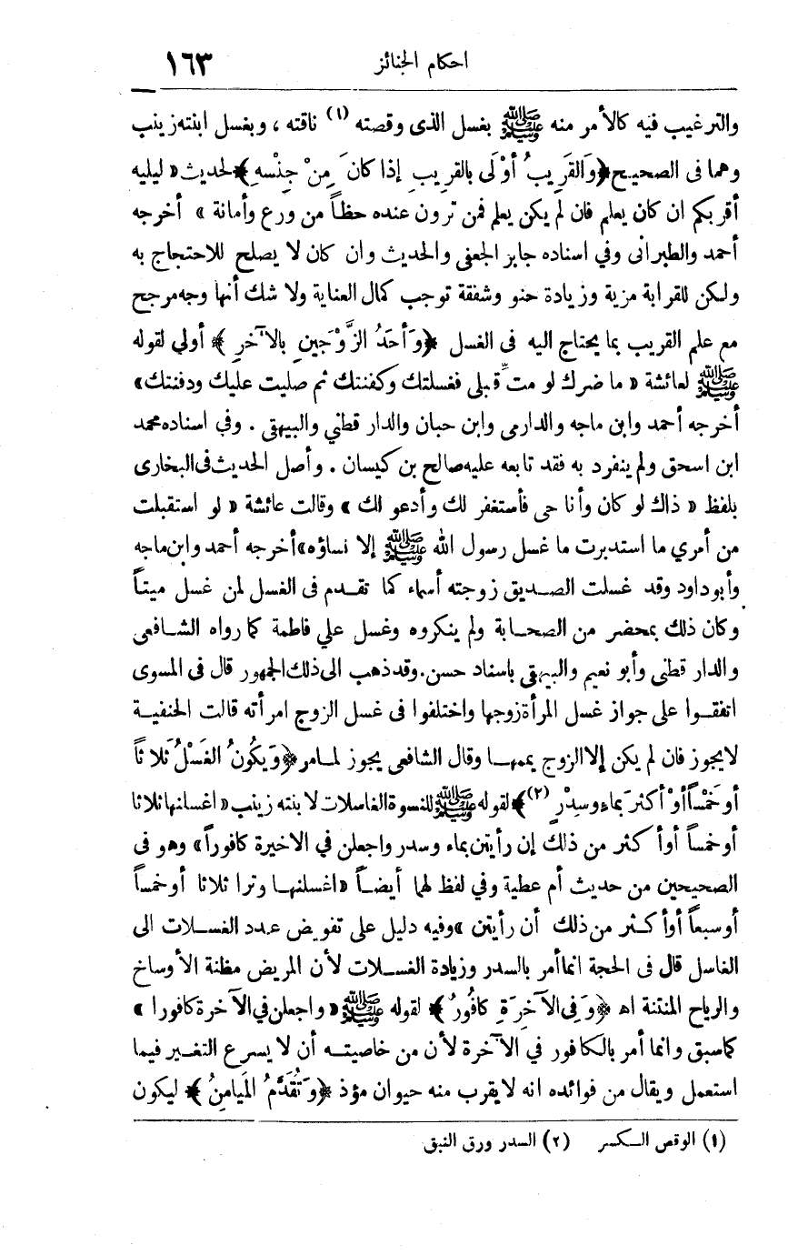 والترغيب فيه كالأمر منه صلى الله عليه وسلم بغسل الذي وقصته ناقته وبغسل ابنته زينب وهما في الصحيح. والقريب أولى بالقريب إذا كان من جنسه لحديث: "ليليه أقربكم إن كان يعلم فإن لم يكن يعلم فمن ترون عنده حظا من ورع وأمانة" أخرجه أحمد والطبراني وفي إسناده جابر الجعفي والحديث وإن كان لا يصلح للاحتجاج به ولكن للقرابة مزية وزيادة حنو وشفقة توجب كمال العناية ولا شك أنها وجه مرجح مع علم القريب بما يحتاج إليه في الغسل. "وأحد الزوجين بالآخر" أولى لقوله صلى الله عليه وسلم لعائشة: "ما ضرك لو مت قبلي فغسلتك وكفنتك ثم صليت عليك ودفنتك" أخرجه أحمد وابن ماجة والدارمي وابن حبان والدارقطني والبيهقي وفي إسناده محمد بن إسحق ولم ينفرد به فقد تابعه عليه صالح بن كيسان, وأصل الحديث في البخاري بلفظ: "ذاك لو كان وأنا حي فأستغفر لك وأدعو لك" وقالت عائشة: لو استقبلت من أمري ما استدبرت ما غسل رسول الله صلى الله عليه وسلم إلا نساؤه. أخرجه أحمد وابن ماجه وأبو داود, وقد غسلت الصديق زوجته أسماء كما تقدم في الغسل لمن غسل ميتا وكان ذلك بمحضر من الصحابة ولم ينكروه, وغسل علي فاطمة كما رواه الشافعي والدارقطني وأبو نعيم والبيهقي بإسناد حسن, وقد ذهب إلى ذلك الجمهور. قال في المسوى: اتفقوا على جواز غسل المرأة زوجها, واختلفوا في غسل الزوج امرأته قالت الحنفية: لا يجوز فإن لم يكن إلا الزوج يممها. وقال الشافعي: يجوز لما مر. "ويكون الغسل ثلاثا أو خمسا أو أكثر بماء وسدر" لقوله صلى الله عليه وسلم للنسوة الغاسلات لابنته زينب: "اغسلنها ثلاثا أو خمسا أو أكثر من ذلك إن رأيتن بماء وسدر واجعلن في الأخيرة كافورا" وهو في الصحيحين من حديث أم عطية وفي لفظ لهما أيضا: "اغسلنها وترا ثلاثا أو خمسا أو سبعا أو أكثر من ذلك إن رأيتن" وفيه دليل على تفويض عدد الغسلات إلى الغاسل. قال في الحجة: إنما أمر بالسدر وزيادة الغسلات لأن المريض مظنة الأوساخ والرياح المنتنة 1هـ. "وفي الآخرة كافورا" لقوله صلى الله عليه وسلم: "واجعلن في الآخرة كافورا" كما سبق, وإنما أمر بالكافور في الآخرة لأن من خاصيته أن لا يسرع التغير فيما استعمل, ويقال من فوائده أنه لا يقرب منه حيوان مؤذ. "وتقدم الميامن" ليكون