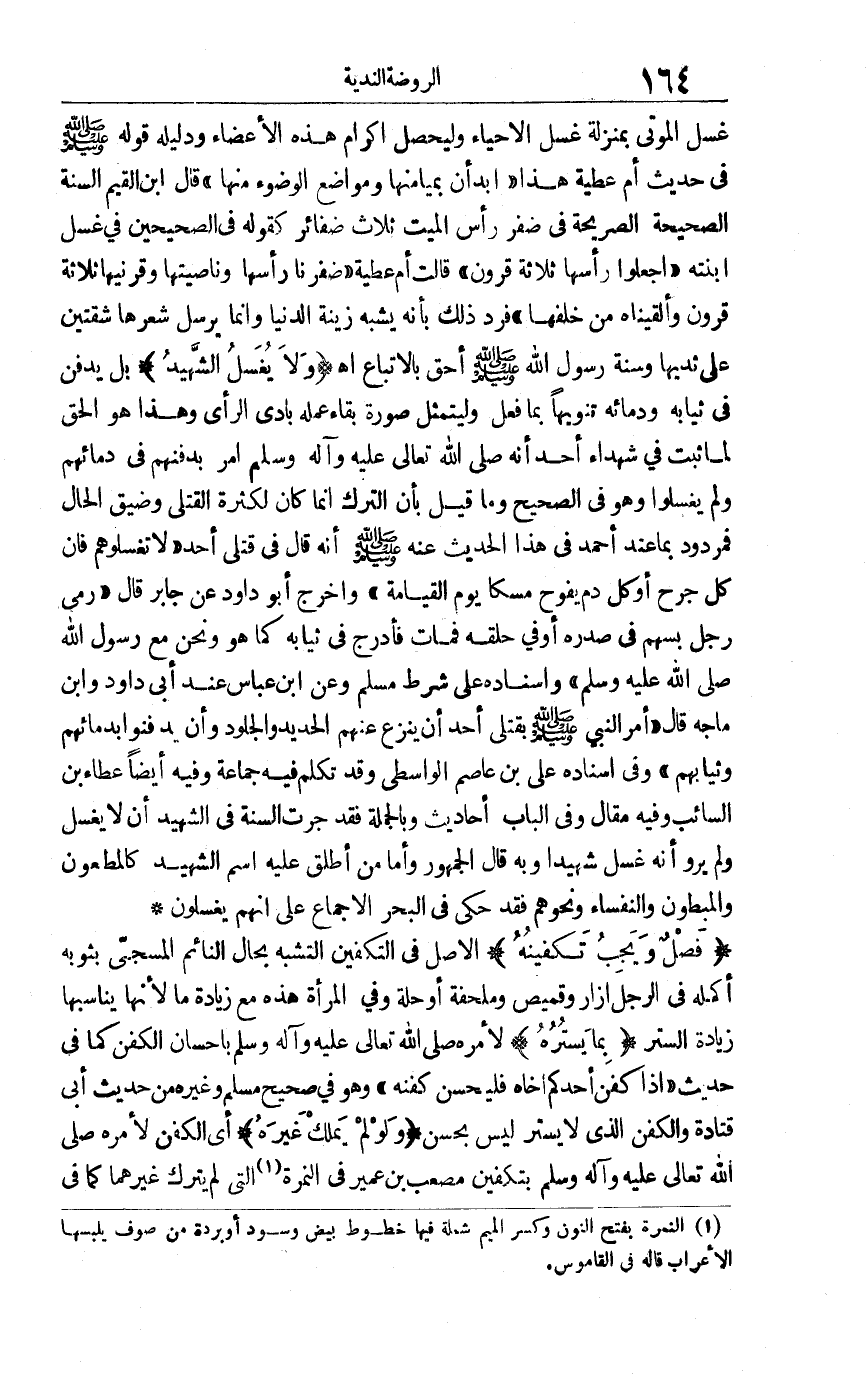 غسل الموتى بمنزلة غسل الأحياء وليحصل إكرام هذه الأعضاء, ودليله قوله صلى الله عليه وسلم في حديث أم عطية هذا: "ابدأن بميامنها ومواضع الضوء منها" قال ابن القيم: السنة الصحيحة الصريحة في ضفر رأس الميت ثلاث ضفائر كقوله في الصحيحين في غسل ابنته: "اجعلوا رأسها ثلاثة قرون" قالت أم عطية: ضفرنا رأسها وناصيتها وقرنيها ثلاثة قرون وألقيناه من خلفها. فرد ذلك بأنه يشبه زينة الدنيا وإنما يرسل شعرها شقتين على ثديها وسنة رسول الله صلى الله عليه وسلم أحق بالاتباع 1هـ. "ولا يغسل الشهيد" بل يدفن في ثيابه ودمائه تنويها بما فعل وليتمثل صورة بقاء عمله بادي الرأي وهذا هو الحق لما ثبت في شهداء أحد أنه صلى الله تعالى عليه وآله وسلم أمر بدفنهم في دمائهم ولم يغسلوا وهو في الصحيح, وما قيل بأن الترك إنما كان لكثرة القتلى وضيق الحال فمردود بما عند أحمد في هذا الحديث عنه صلى الله عليه وسلم أنه قال في قتلى أحد: "لا تغسلوهم فإن كل جرح أو كل دم يفوح مسكا يوم القيامة" وأخرج أبو داود عن جابر قال: رمي رجل بسهم في صدره أو في حلقه فمات فأدرج في ثيابه كما هو ونحن مع رسول الله صلى الله عليه وسلم. وإسناده على شرط مسلم, وعن ابن عباس عند أبي داود وابن ماجة قال: أمر النبي صلى الله عليه وسلم بقتلى أحد أن ينزع عنهم الحديد والجلود وأن يدفنوا بدمائهم وثيابهم. وفي إسناده علي بن عاصم الواسطي وقد تكلم فيه جماعة وفيه أيضا عطاء بن السائب وفيه مقال وفي الباب أحاديث. وبالجملة: فقد جرت السنة في الشهيد أن لا يغسل ولم يرو أنه غسل شهيدا وبه قال الجمهور, وأما من أطلق عليه اسم الشهيد كالمطعون والمبطون والنفساء ونحوهم فقد حكى في البحر الإجماع على أنهم يغسلون.
