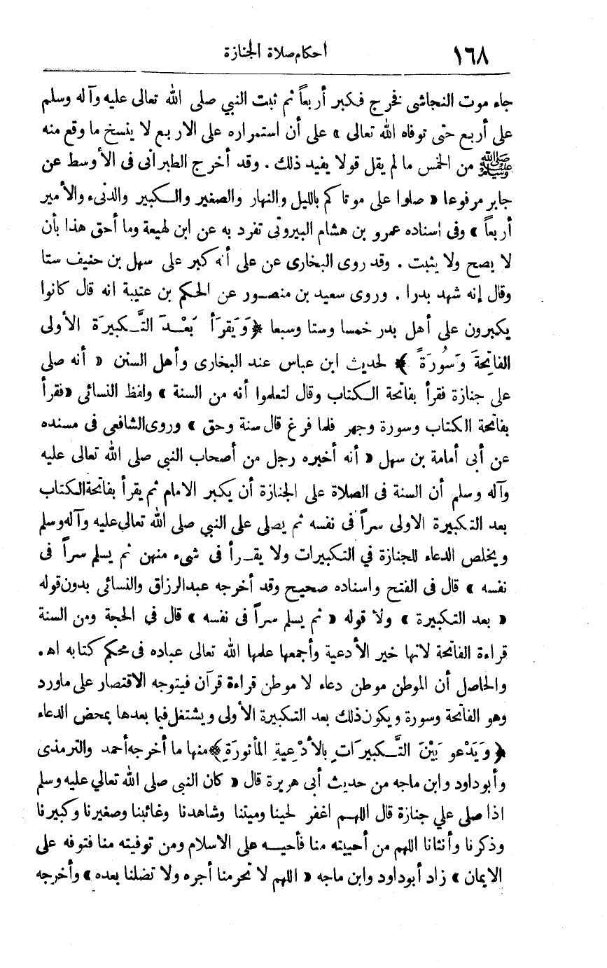 جاء موت النجاشي فخرج فكبر أربعا ثم ثبت النبي صلى الله تعالى عليه وآله وسلم على أربع حتى توفاه الله تعالى, على أن استمراره على الأربع لا ينسخ ما وقع منه صلى الله عليه وسلم من الخمس ما لم يقل قولا يفيد ذلك, وقد أخرج الطبراني في الأوسط عن جابر مرفوعا: "صلوا على موتاكم بالليل والنهار والصغير والكبير والدنيء والأمير أربعا" وفي إسناده عمرو بن هشام البيروتي تفرد به عن ابن لهيعة, وما أحق هذا بأن لا يصح ولا يثبت, وقد روى البخاري عن علي أنه كبر على سهل بن حنيف ستا وقال إنه شهد بدرا وروى سعيد بن منصور عن الحكم بن عتيبة أنه قال: كانوا يكبرون على أهل بدر خمسا وستا وسبعا. "ويقرأ بعد التكبيرة الأولى الفاتحة وسورة" لحديث ابن عباس عند البخاري وأهل السنن أنه صلى على جنازة فقرأ بفاتحة الكتاب وقال: لتعلموا أنه من السنة. ولفظ النسائي: فقرأ بفاتحة الكتاب وسورة وجهر فلما فرغ قال سنة وحق. وروى الشافعي في مسنده عن أبي أمامة بن سهل أنه أخبره رجل من أصحاب النبي صلى الله تعالى عليه وآله وسلم أن السنة في الصلاة على الجنازة أن يكبر الإمام ثم يقرأ بفاتحة الكتاب بعد التكبيرة الأولى سرا في نفسه ثم يصلي على النبي صلى الله تعالى عليه وآله وسلم ويخلص الدعاء للجنازة في التكبيرات ولا يقرأ في شيء منهن ثم يسلم سرا في نفسه. قال في الفتح: وإسناده صحيح, وقد أخرجه عبد الرزاق والنسائي بدون قوله: "بعد التكبيرة" ولا قوله: "ثم يسلم سرا في نفسه". قال في الحجة: ومن السنة قراءة الفاتحة لأنها خير الأدعية وأجمعها علمها الله تعالى عباده في محكم كتابه اهـ.