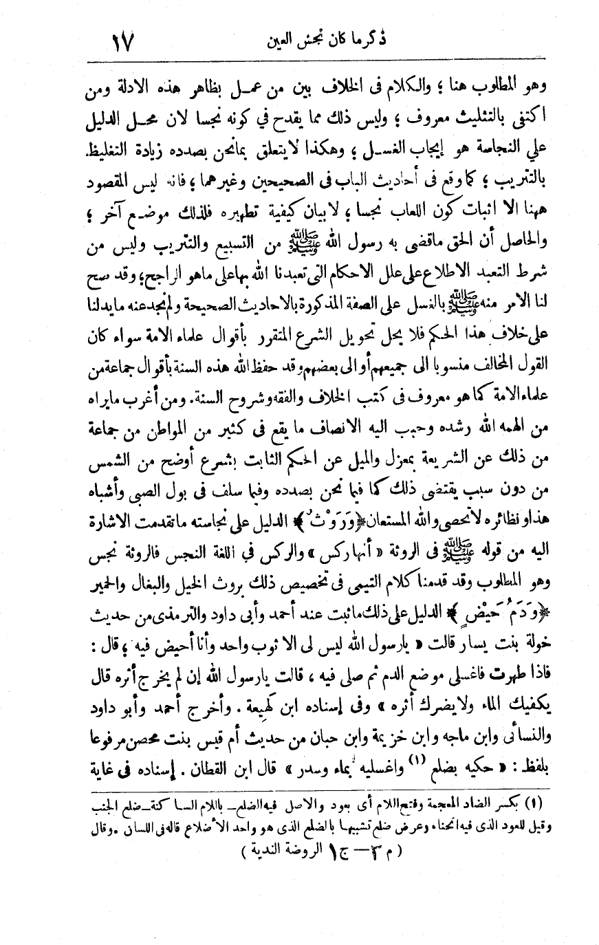 وروث الدليل على نجاسته ما تقدمت الإشارة إليه من قوله صلى الله عليه وسلم في الروثة: "إنها ركس" والركس في اللغة النجس فالروثة نجس وهو المطلوب وقد قدمنا كلام التيمي في تخصيص ذلك بروث الخيل والبغال والحمير. "ودم حيض" الدليل على ذلك ما ثبت عند أحمد وأبي داود والترمذي من حديث خولة بنت يسار قالت: يا رسول الله ليس لي إلا ثوب واحد وأنا أحيض فيه قال: "فإذا طهرت فاغسلي موضع الدم ثم صلي فيه" قالت: يا رسول الله إن لم يخرج أثره, قال: "يكفيك الماء ولا يضرك أثره" وفي إسناده ابن لهيعة, وأخرج أحمد وأبو داود والنسائي وابن ماجه وابن خزيمة وابن حبان من حديث أم قيس بنت محصن مرفوعاً بلفظ: "حُكّيه بضِلَع1 واغسليه بماء وسِدْر". قال ابن القطان: إسناده في غاية