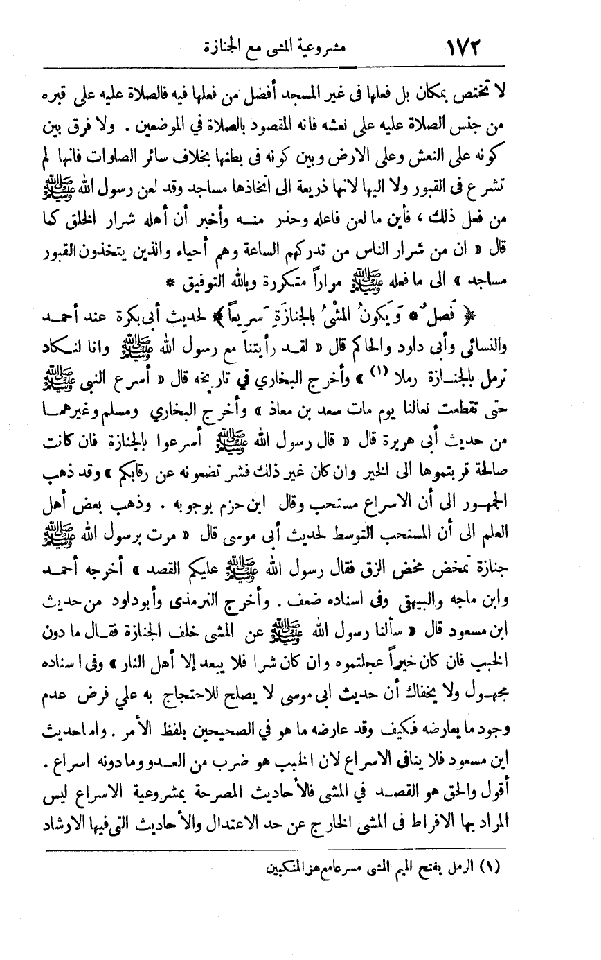 فصل ويكون المشي بالجنازة سريعاً لحديث أبي بكرة عند أحمد والنسائي وأبي داود والحاكم قال: لقد رأيتنا مع رسول الله عليه وسلم وإنا لنكاد نرمل بالجنازة رملا1, وأخرج البخاري في تاريخه قال: أسرع النبي صلى الله عليه وسلم حتى تقطعت نعالنا يوم مات سعد بن معاذ. وأخرج البخاري ومسلم وغيرهما من حديث أبي هريرة قال: قال رسول الله صلى الله عليه وسلم: "أسرعوا بالجنازة فإن كانت صالحة قربتموها إلى الخير وإن كان غير ذلك فشر تضعونه عن رقابكم" وقد ذهب الجمهور إلى أن الإسراع مستحب, وقال ابن حزم: بوجوبه. وذهب بعض أهل العلم إلى أن المستحب التوسط لحديث أبي موسى قال: مرت برسول الله صلى الله عليه وسلم جنازة تمخض مخض الزق فقال رسول الله صلى الله عليه وسلم: "عليكم القصد" أخرجه أحمد وابن ماجة والبيهقي وفي إسناده ضعف وأخرج الترمذي وأبو داود من حديث ابن مسعود قال: سألنا رسول الله صلى الله عليه وسلم عن المشي خلف الجنازة فقال: "ما دون الخبب فإن كان خيرا عجلتموه وإن كان شرا فلا يبعد إلا أهل النار" وفي إسناده مجهول, ولا يخفاك أن حديث أبي موسى لا يصلح للاحتجاج به على فرض عدم وجود ما يعارضه فكيف وقد عارضه ما هو في الصحيحين بلفظ الأمر. وأما حديث ابن مسعود فلا ينافي الإسراع لأن الخبب هو ضرب من العدو وما دونه إسراع. أقول: والحق هو القصد في المشي فالأحاديث المصرحة بمشروعية الإسراع ليس المراد بها الإفراط في المشي الخارج عن حد الاعتدال, والأحاديث التي فيها الإرشاد