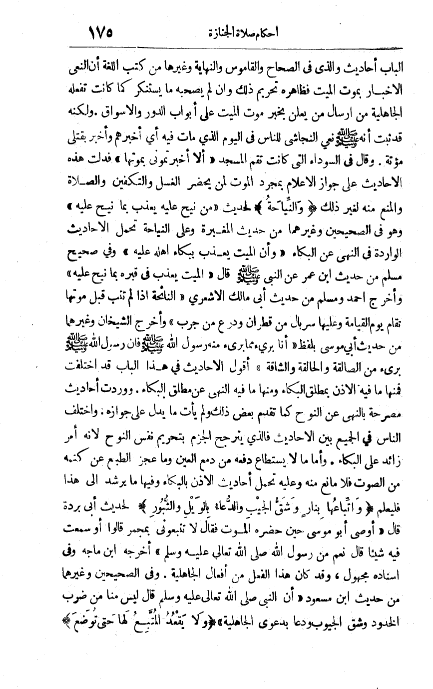 الباب أحاديث والذي في الصحاح والقاموس والنهاية وغيرها من كتب اللغة أن النعي الإخبار بموت الميت فظاهره تحريم ذلك وإن لم يصحبه ما يستنكر كما كانت تفعله الجاهلية من إرسال من يعلن بخبر موت الميت على أبواب الدور والأسواق, ولكنه قد ثبت أنه صلى الله عليه وسلم نعى النجاشي للناس في اليوم الذي مات فيه أي أخبرهم وأخبر بقتلى مؤتة وقال في السوداء التي كانت تقم المسجد: "ألا أخبرتموني بموتها" فدلت هذه الأحاديث على جواز الإعلام بمجرد الموت لمن يحضر الغسل والتكفين والصلاة والمنع منه لغير ذلك. "والنياحة" لحديث: "من نيح عليه يعذب بما نيح عليه" وهو في الصحيحين وغيرهما من حديث المغيرة وعلى النياحة تحمل الأحاديث الواردة في النهي عن البكاء وأن الميت يعذب ببكاء أهله عليه. وفي صحيح مسلم من حديث ابن عمر عن النبي صلى الله عليه وسلم قال: "الميت يعذب في قبره بما نيح عليه" وأخرج أحمد ومسلم من حديث أبي مالك الأشعري: "النائحة إذا لم تتب قبل موتها تقام يوم القيامة وعليها سربال من قطران ودرع من جرب" وأخرج الشيخان وغيرهما من حديث أبي موسى بلفظ: أنا بريء مما برئ منه رسول الله صلى الله عليه وسلم فإن رسول الله صلى الله عليه وسلم: بريء من الصالقة والحالقة والشاقة.