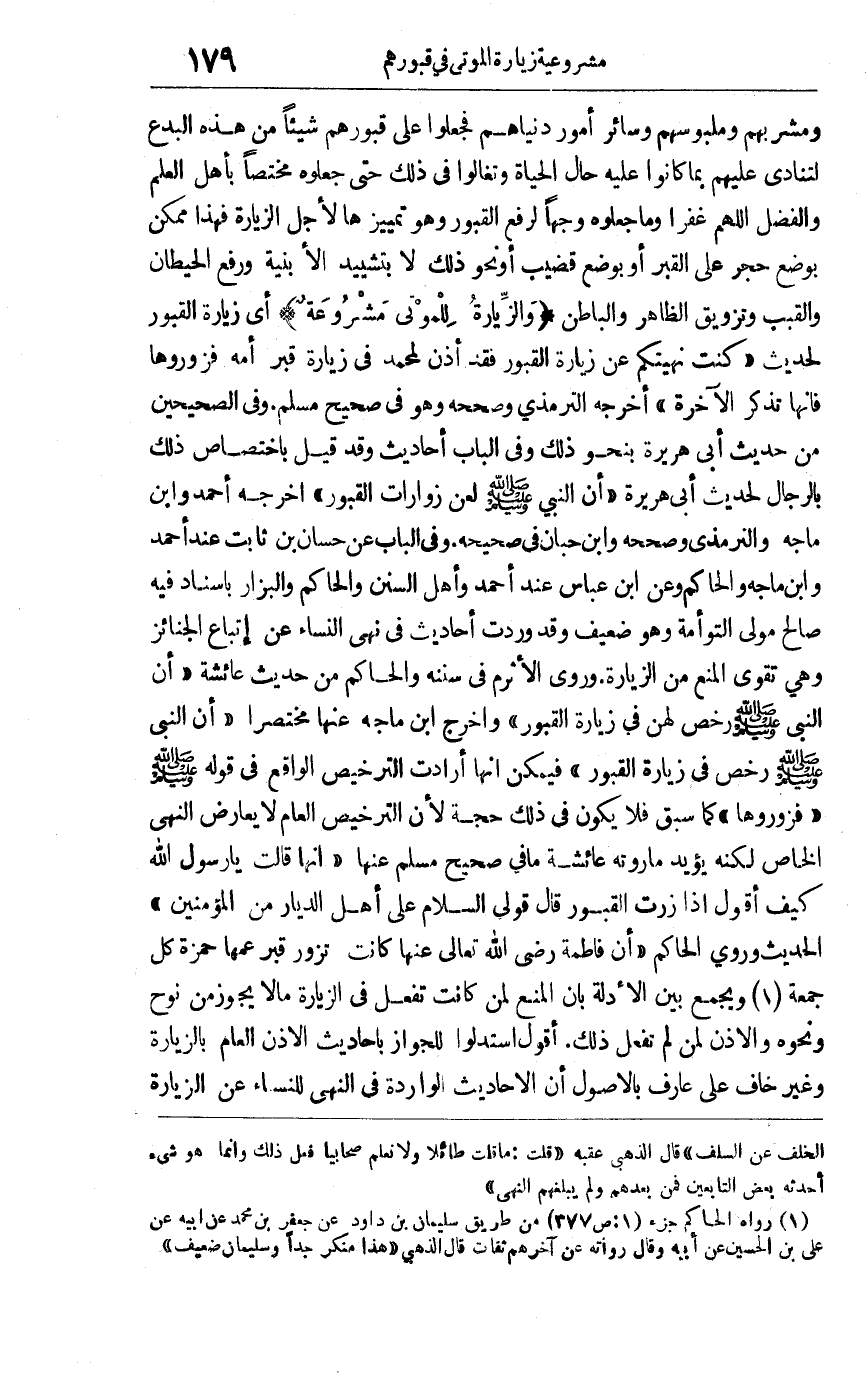 ومشربهم وملبوسهم وسائر أمور دنياهم فجعلوا على قبورهم شيئا من هذه البدع لتنادي عليهم بما كانوا عليه حال الحياة وتغالوا في ذلك حتى جعلوه مختصا بأهل العلم والفضل اللهم غفرا وما جعلوه وجها لرفع القبور وهو تمييزها لأجل الزيارة فهذا ممكن بوضع حجر على القبر أو بوضع قضيب أو نحو ذلك لا بتشييد الأبنية ورفع الحيطان والقبب وتزويق الظاهر والباطن. "والزيارة للموتى مشروعة" أي زيارة القبور لحديث: "كنت نهيتكم عن زيارة القبور فقد أذن لمحمد في زيارة قبر أمه فزوروها فإنها تذكر الآخرة" أخرجه الترمذي وصححه وهو في الصحيح مسلم وفي الصحيحين من حديث أبي هريرة بنحو ذلك وفي الباب أحاديث, وقد قيل باختصاص ذلك بالرجال لحديث أبي هريرة أن النبي صلى الله عليه وسلم: لعن زوارات القبور أخرجه أحمد وابن ماجه والترمذي وصححه وابن حبان في صحيحه, وفي الباب عن حسان بن ثابت عند أحمد وابن ماجة والحاكم وعن ابن عباس عند أحمد وأهل السنن والحاكم والبزار بإسناد فيه صالح مولى التوأمة وهو ضعيف وقد وردت أحاديث في نهي النساء عن اتباع الجنائز وهي تقوي المنع من الزيارة وروى الأثرم في سننه والحاكم من حديث عائشة أن النبي صلى الله عليه وسلم رخص لهن في زيارة القبور وأخرج ابن ماجة عنها مختصرا أن النبي صلى الله عليه وسلم رخص في زيارة القبور فيمكن أنها أرادت الترخيص الواقع في قوله صلى الله عليه وسلم: "فزوروها" كما سبق فلا يكون في ذلك حجة لأن الترخيص العام لا يعارض النهي الخاص لكنه يؤيد ما روته عائشة ما في صحيح مسلم عنها أنها قالت: يا رسول الله كيف أقول إذا زرت القبور؟ قال: "قولي السلام على أهل الديار من المؤمنين" الحديث, وروى الحاكم أن فاطمة رضي الله تعالى عنها كانت تزور قبر عمها حمزة كل جمعة1 ويجمع بين الأدلة بأن المنع لمن كانت تفعل في الزيارة ما لا يجوز من نوح ونحوه والإذن لمن لم تفعل ذلك. أقول: استدلوا للجواز بأحاديث الإذن العام بالزيارة وغير خاف على عارف بالأصول أن الأحاديث الواردة في النهي للنساء عن الزيارة