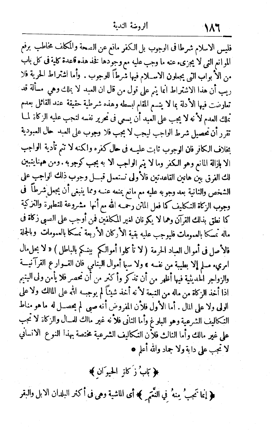 فليس الإسلام شرطا في الوجوب بل الكفر مانع عن الصحة والمكلف مخاطب برفع الموانع التي لا يجزئ عنه ما وجب عليه مع وجودها فخذ هذه قاعدة كلية في كل باب من الأبواب التي يجعلون الإسلام فيها شرطا للوجوب واما اشتراط الحرية فلا ريب أن هذا الاشتراط إنما يتم على قول من قال: إن العبد لا يملك وهي مسألة قد تعارضت فيها الأدلة بما لا يتسع لبسطه وهذه شرطية حقيقة عند القائل بعدم تملك العدم لأنه لا يجب على العبد أن يسعى في تحرير نفسه لتجب عليه الزكاة لما تقرر أن تحصيل شرط الواجب ليجب لا يجب فلا وجوب على العبد حال العبودية بخلاف الكافر فإن الوجوب ثابت عليه في حال كفره ولكنه لا تتم تأدية الواجب إلا بإزالة المانع وهو الكفر وما لا يتم الواجب إلا به يجب كوجوبه ومن ههنا يتبين لك الفرق بين هاتين القاعدتين فالاولى تستعمل قبل وجوب ذلك الواجب على الشخص والثانية بعد وجوبه عليه مع مانع يمنعه عنه ومما ينبغي أن يجعل شرطا في وجوب الزكاة التكليف كما فعل الماتن رح مع أنها مشروعة للتطهرة والتزكية كما نطق بذلك القرآن وهما لا يكونان لغير المكلفين فمن أوجب على الصبي زكاة في ماله تمسكا بالعمومات فليوجب عليه بقية الأركان الأربعة تمسكا بالعمومات. وبالجملة: فالأصل في أموال العباد الحرمة: {لاَ تَأْكُلُوا أَمْوَالَكُمْ بَيْنَكُمْ بِالْبَاطِلِ} "لا يحل مال امرئ مسلم إلا بطيبة من نفسه" ولا سيما أموال اليتامى فإن القوارع القرآنية والزواجر الحديثية فيها أظهر من أن تذكر وأكثر من أن تحصر فلا يأمن ولي اليتيم إذا أخذ الزكاة من ماله من التبعة لأنه أخذ شيئا لم يوجبه الله على المالك ولا على الولي ولا على المال. أمال الأول: فلأن المفروض أنه صبي لم يحصل له فما هو مناط التكاليف الشرعية وهو البلوغ وأما الثاني: فلأنه غير مالك للمال والزكاة لا تجب على غير مالك. وأما الثالث: فلأن التكاليف الشرعية مختصة بهذا النوع الإنساني لا تجب على دابة ولا جماد والله أعلم.