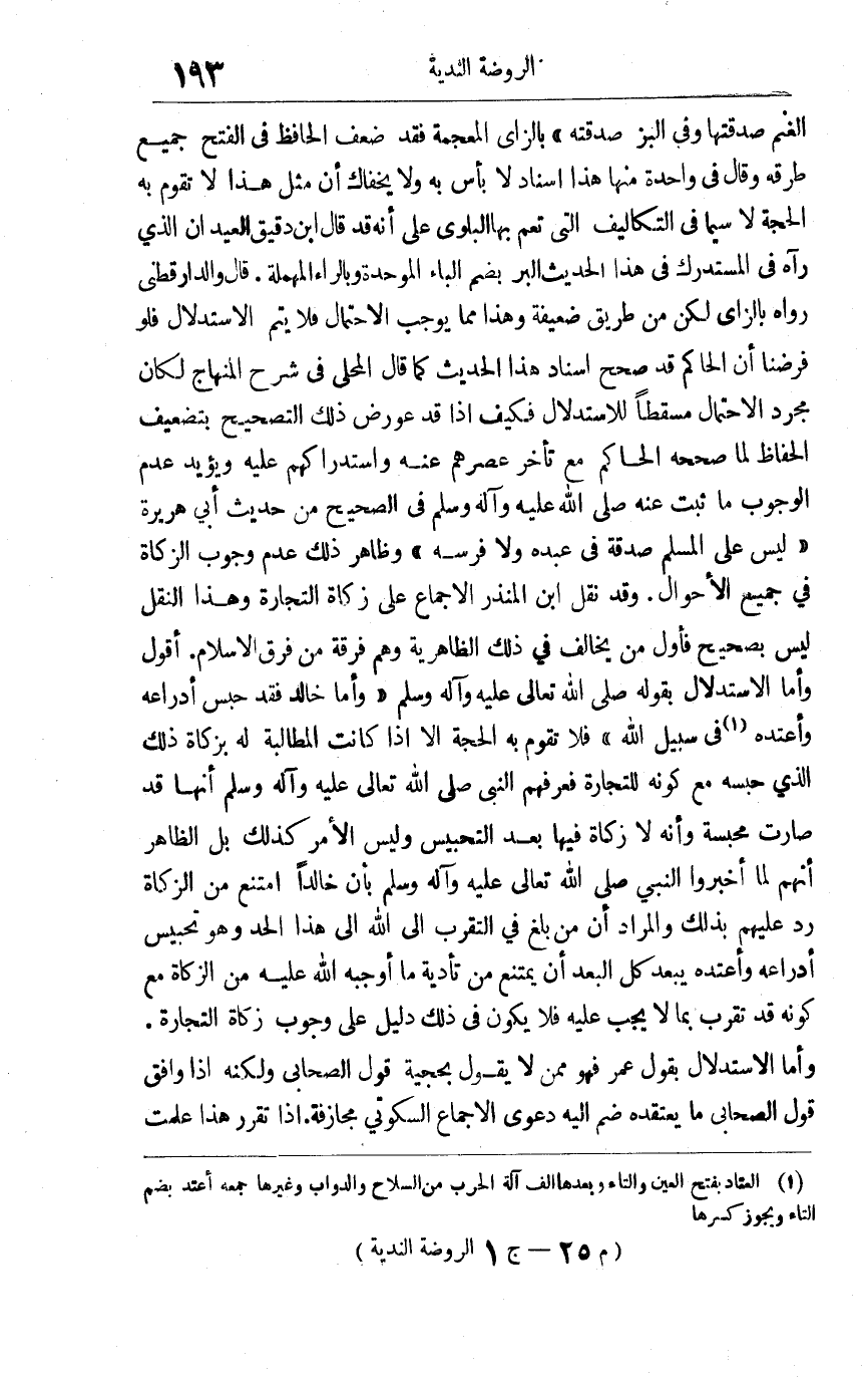 الغنم صدقتها وفي البز صدقته" بالزاي المعجمة فقد ضعف الحافظ في الفتح جميع طرقه وقال في واحدة منها: هذا إسناد لا بأس به, ولا يخفاك أن مثل هذا لا تقوم به الحجة لا سيما في التكاليف التي تعم بها البلوى على أنه قد قال ابن دقيق العيد: إن الذي رآه في المستدرك في هذا الحديث البر بضم الباء الموحدة وبالراء المهملة. قال: والدارقطني رواه بالزاي لكن من طريق ضعيفة وهذا مما يوجب الاحتمال فلا يتم الاستدلال فلو فرضنا أن الحاكم قد صحح إسناد هذا الحديث كما قال المحلي في شرح المنهاج لكان مجرد الاحتمال مسقطا للاستدلال فكيف إذا قد عورض ذلك التصحيح بتضعيف الحفاظ لما صححه الحاكم مع تأخر عصرهم عنه واستدراكهم عليه, ويؤيد عدم الوجوب ما ثبت عنه صلى الله عليه وآله وسلم في الصحيح من حديث أبي هريرة: "ليس على المسلم صدقة في عبده ولا فرسه" وظاهر ذلك عدم وجوب الزكاة في جميع الأحوال, وقد نقل ابن المنذر الإجماع على زكاة التجارة وهذا النقل ليس بصحيح فأول من يخالف في ذلك الظاهرية وهم فرقة من فرق الإسلام. أقول: وأما الاستدلال بقوله صلى الله تعالى عليه وآله وسلم: "وأما خالد فقد حبس أدراعه وأعتده1 في سبيل الله" فلا تقوم به الحجة إلا إذا كانت المطالبة بزكاة ذلك الذي حبسه مع كونه للتجارة فعرّفهم النبي صلى الله تعالى عليه وآله وسلم أنها قد صارت محبسة وأنه لا زكاة فيها بعد التحبيس وليس الأمر كذلك بل الظاهر أنهم لما أخبروا النبي صلى الله تعالى عليه وآله وسلم بأن خالدا امتنع من الزكاة رد عليهم بذلك, والمراد أن من بلغ في التقرب إلى الله إلى هذا الحد وهو تحبيس أدراعه وأعتده يبعد كل البعد أن يمتنع من تأدية ما أوجبه الله عليه من زكاة التجارة. وأما الاستدلال بقول عمر فهو ممن لا يقول بجحية قول الصحابي ولكنه إذا وافق قوله الصحابي ما يعتقده ضم إليه دعوى الإجماع السكوتي مجازفة. إذا تقرر هذا علمت