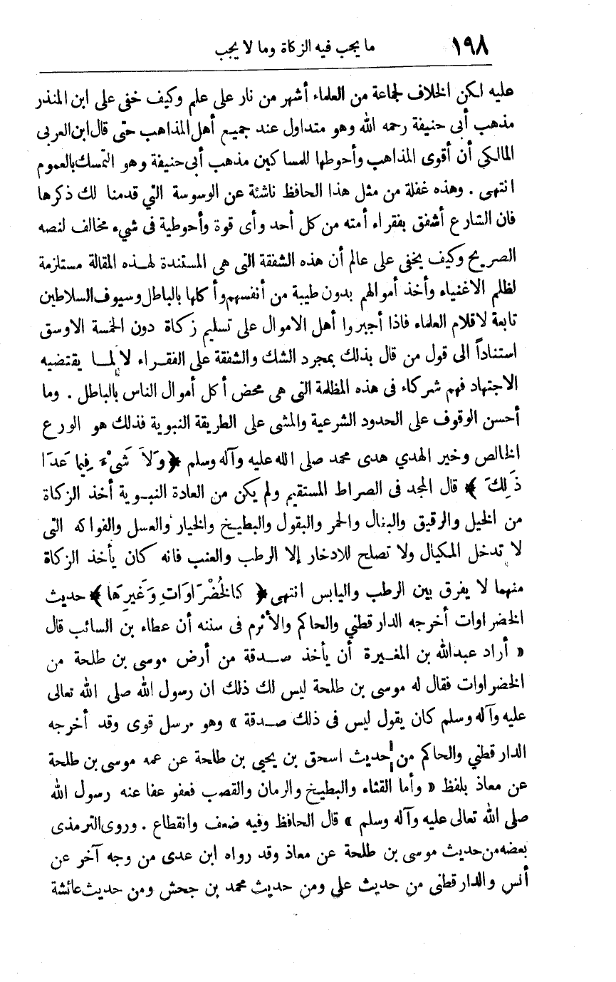 عليه لكن الخلاف لجماعة من العلماء أشهر من نار على علم وكيف خفي على ابن المنذر مذهب أبي حنيفة رح وهو متداول عند جميع أهل المذاهب حتى قال ابن العربي المالكي: إن أقوى المذاهب وأحوطها للمساكين مذهب أبي حنيفة وهو التمسك بالعموم انتهى. وهذه غفلة من مثل هذا الحافظ ناشئة عن الوسوسة التي قدمنا لك ذكرها فإن الشارع أشفق بفقراء أمته من كل أحد وأي قوة وأحوطية في شيء مخالف لنصه الصريح وكيف يخفى على عالم أن هذه الشفقة التي هي المستندة لهذه المقالة مستلزمة لظلم الأغنياء وأخذ أموالهم بدون طيبة من أنفسهم وأكلها بالباطل وسيوف السلاطين تابعة لأقلام العلماء فإذا أجبروا أهل الأموال على تسليم زكاة دون الخمسة الأوسق استناداً إلى قول من قال بذلك بمجرد الشك والشفقة على الفقراء لا لما يقتضيه الاجتهاد فهم شركاء في هذه المظلمة التي هي محض أكل أموال الناس بالباطل. وما أحسن الوقوف على الحدود الشرعية والمشي على الطريقة النبوية فذلك هو الورع الخالص وخير الهدي هدي محمد صلى الله عليه وآله وسلم. ولا شيء فيما عدا ذلك. قال المجد في الصراط المستقيم ولم يكن من العادة النبوية أخذ الزكاة من الخيل والرقيق والبغال والحمر والبقول والبطيخ والخيار والعسل والفواكه التي لا تدخل المكيال ولا تصلح للادخار إلا الرطب والعنب فإنه كان يأخذ الزكاة منهما لا يفرق بين الرطب واليابس انتهى. كالخضروات وغيرها حديث الخضراوات أخرجه الدارقطني والحاكم والأثرم في سننه أن عطاء بن السائب قال: أراد عبد الله بن المغيرة أن يأخذ صدقة من أرض موسى بن طلحة من الخضراوات فقال له موسى بن طلحة: ليس لك ذلك أن رسول الله صلى الله تعالى عليه وآله وسلم كان يقول: "ليس في ذلك صدقة" وهو مرسل قوي وقد أخرجه الدارقطني والحاكم من حديث إسحق بن يحيى ابن طلحة عن عمه موسى بن طلحة عن معاذ بلفظ: وأما القثاء والبطيخ والرمان والقصب فعفو عفا عنه رسول الله صلى الله تعالى عليه وآله وسلم. قال الحافظ: وفيه ضعف وانقطاع وروى الترمذي بعضه من حديث موسى بن طلحة عن معاذ وقد رواه ابن عدي من وجه آخر عن أنس والدارقطني من حديث علي ومن حديث محمد بن جحش ومن حديث عائشة,