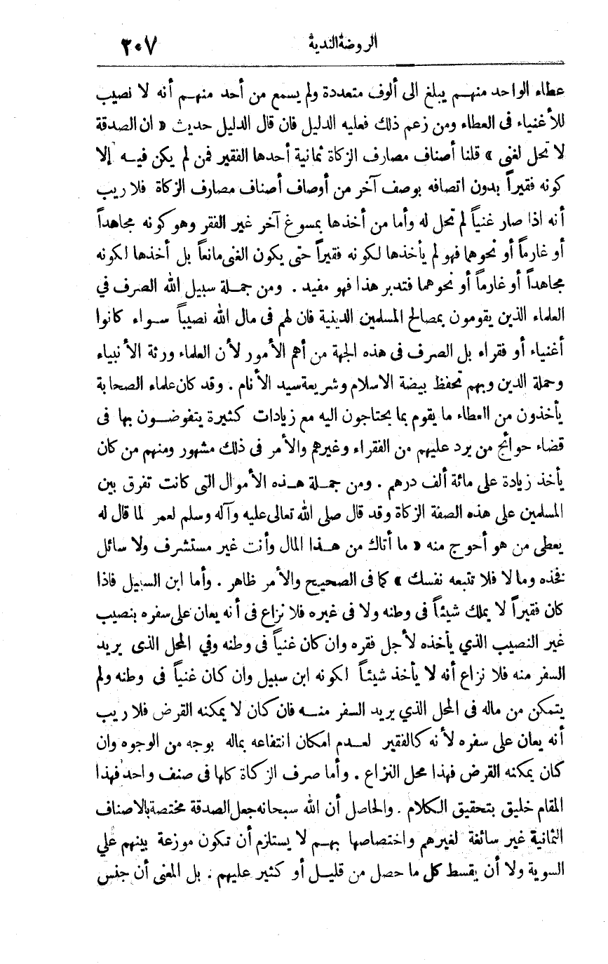 عطاء الواحد منهم يبلغ إلى ألوف متعددة ولم يسمع من أحد منهم أنه لا نصيب للأغنياء في العطاء ومن زعم ذلك فعليه الدليل, فإن قال الدليل حديث: "إن الصدقة لا تحل لغني" قلنا أصناف مصارف الزكاة ثمانية أحدها الفقير فمن لم يكن فيه إلا كونه فقيرا بدون اتصافه بوصف آخر من أوصاف أصناف مصارف الزكاة فلا ريب أنه إذا صار غنيا لم تحل له, وأما من أخذها بمسوغ آخر غير الفقر وهو كونه مجاهداً أو غارماً أو نحوهما فهو لم يأخذها لكونه فقيرا حتى يكون الغنى مانعا بل أخذها لكونه مجاهدا أو غارما أو نحوهما فتدبر هذا فهو مفيد, ومن جملة سبيل الله الصرف في العلماء الذين يقومون بمصالح المسلمين الدينية فإن لهم في مال الله نصيبا سواء كانوا أغنياء أو فقراء بل الصرف في هذه الجهة من أهم الأمور لأن العلماء ورثة الأنبياء وحملة الدين وبهم تحفظ بيضة الإسلام وشريعة سيد الأنام وقد كان علماء الصحابة يأخذون من العطاء ما يقوم بما يحتاجون إليه مع زيادات كثيرة يتفوضون بها في قضاء حوائج من يرد عليهم من الفقراء وغيرهم والأمر في ذلك مشهور, ومنهم من كان يأخذ زيادة على مائة ألف درهم ومن جملة هذه الأموال التي كانت تفرق بين المسلمين على هذه الصفة الزكاة, وقد قال صلى الله تعالى عليه وآله وسلم لعمر لما قال له يعطي من هو أحوج منه: "ما آتاك من هذا المال وأنت غير مستشرف ولا سائل فخذه وما لا فلا تتبعه نفسك" كما في الصحيح والأمر ظاهر, وأما ابن السبيل فإذا كان فقيرا لا يملك شيئا في وطنه ولا في غيره فلا نزاع في أنه يعان على سفره بنصيب غير النصيب الذي يأخذه لأجل فقره وإن كان غنيا في وطنه وفي المحل الذي يريد السفر منه فلا نزاع أنه لا يأخذ شيئا لكونه ابن سبيل, وإن كان غنيا في وطنه وفي المحل الذي يريد السفر منه فإن كان لا يمكنه القرض فلا ريب أنه يعان على سفره لأنه كالفقير لعدم إمكان انتفاعه بماله بوجه من الوجوه وإن كان يمكنه القرض فهذا محل النزاع, وأما صرف الزكاة كلها في صنف واحد فهذا المقام خليق بتحقيق الكلام. والحاصل: أن الله سبحانه جعل الصدقة مختصة بالأصناف الثمانية غير سائغة لغيرهم واختصاصها بهم لا يستلزم أن تكون موزعة بينهم على السوية ولا أن يقسط كل ما حصل من قليل أو كثير عليهم بل المعنى أن جنس