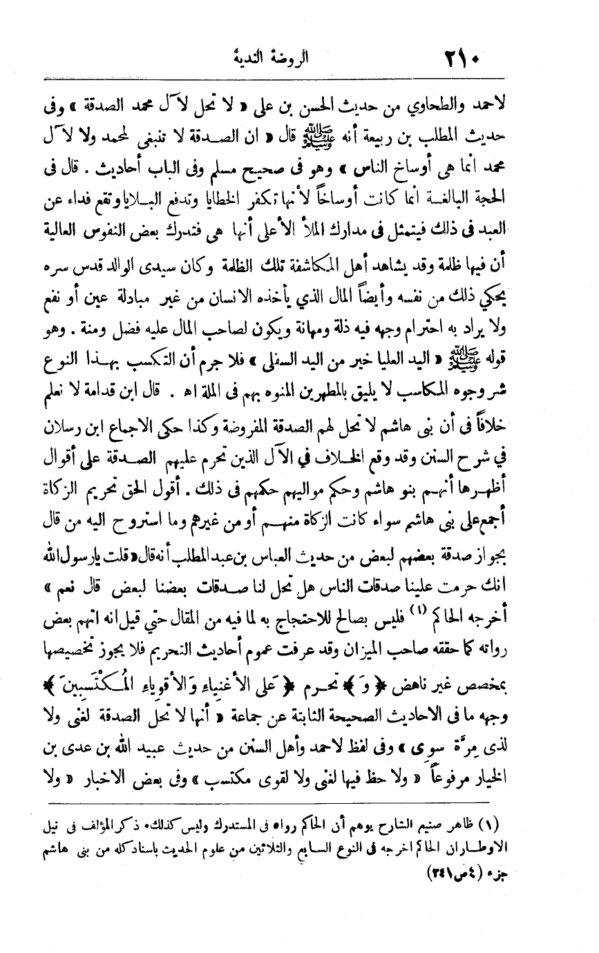 لأحمد والطحاوي من حديث الحسن بن علي: "لا تحل لآل محمد الصدقة". وفي حديث المطلب بن ربيعة أنه صلى الله عليه وسلم قال: "إن الصدقة لا تنبغي لمحمد ولا لآل محمد إنما هي أوساخ الناس" وهو في صحيح مسلم وفي الباب أحاديث قال في الحجة البالغة: إنما كانت أوساخا لأنها تكفر الخطايا وتدفع البلايا وتقع فداء عن العبد في ذلك فيتمثل في مدارك الملأ الأعلى أنها هي فتدرك بعض النفوس العالية أن فيها ظلمة. وقد يشاهد أهل المكاشفة تلك الظلمة, وكان سيدي الوالد قدس سره يحكي ذلك من نفسه. وأيضا المال الذي يأخذه الإنسان من غير مبادلة عين أو نفع ولا يراد به احترام وجهه فيه ذلة ومهانة ويكون لصاحب المال عليه فضل ومنة, وهو قوله صلى الله عليه وسلم: "اليد العليا خير من اليد السفلى" فلا جرم أن التكسب بهذا النوع شر وجوه المكاسب لا يليق بالطهرين المنوه بهم في الملة اهـ. قال ابن قدامة: لا نعلم خلافا في أن بني هاشم لا تحل لهم الصدقة المفروضة, وكذا حكى الإجماع ابن رسلان في شرح السنن وقد وقع الخلاف في الآل الذين تحرم عليهم الصدقة على أقوال أظهرها أنهم بنو هاشم وحكم مواليهم حكمهم في ذلك. أقول: الحق تحريم الزكاة أجمع على بني هاشم سواء كانت الزكاة منهم أو من غيرهم وما استروح إليه من قال بجواز صدقة بعضهم لبعض من حديث العباس بن عبد المطلب أنه قال: قلت يا رسول الله إنك حرمت علينا صدقات الناس هل تحل لنا صدقات بعضنا لبعض؟ قال: "نعم" أخرجه الحاكم1 فليس بصالح للاحتجاج به لما فيه من المقال حتى قيل إنه اتهم بعض رواته كما حققه صاحب الميزان وقد عرفت عموم أحاديث التحريم فلا يجوز تخصيصها بمخصص غير ناهض. "و" تحرم "على الأغنياء والأقوياء المكتسبين" وجهه ما في الأحاديث الصحيحة الثابتة عن جماعة: "أنها لا تحل الصدقة لغني ولا لذي مرة سوي" وفي لفظ لأحمد وأهل السنن من حديث عبيد الله بن عدي بن الخيار مرفوعا: "ولاحظ فيها لغني ولا لقوي مكتسب" وفي بعض الأخبار: "ولا